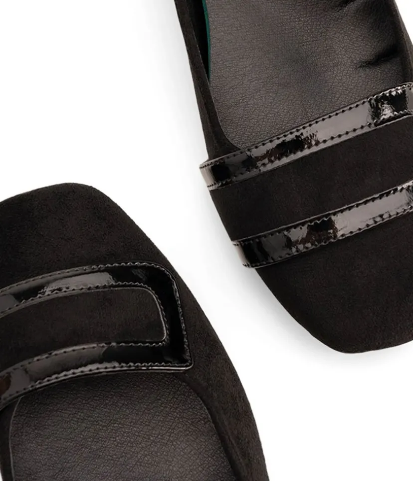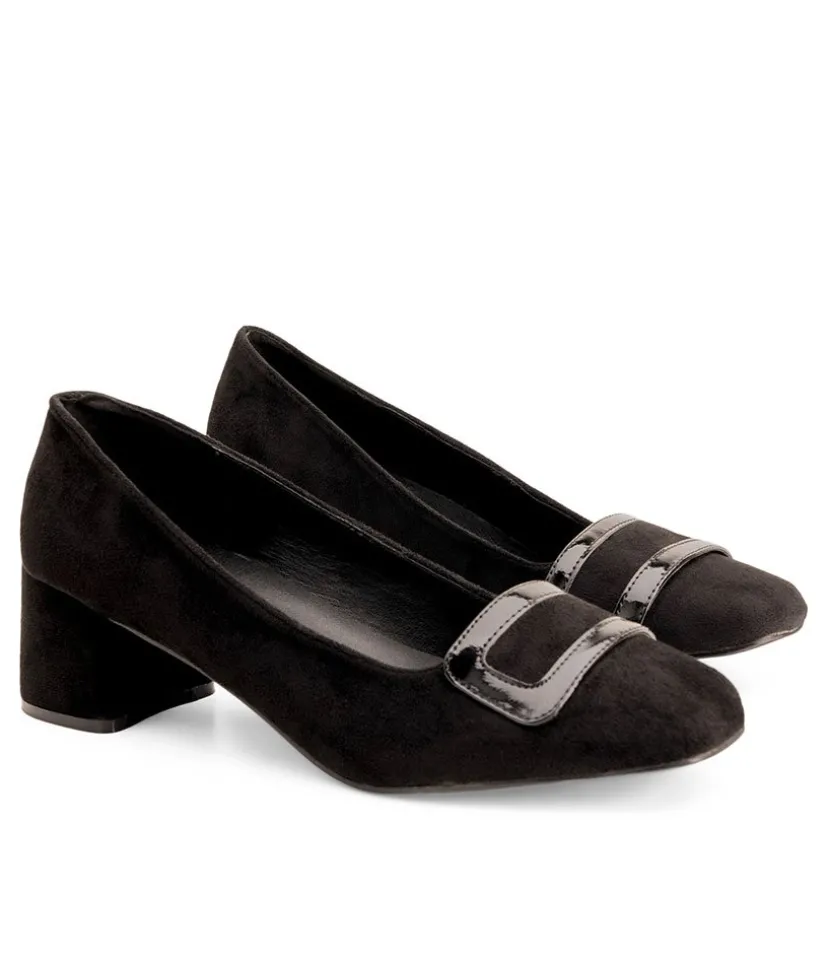 A Stylish Square Block Heeled shoe in black faux suede with patent rectangular applique on the vamp. This style will take you from day to night easily.