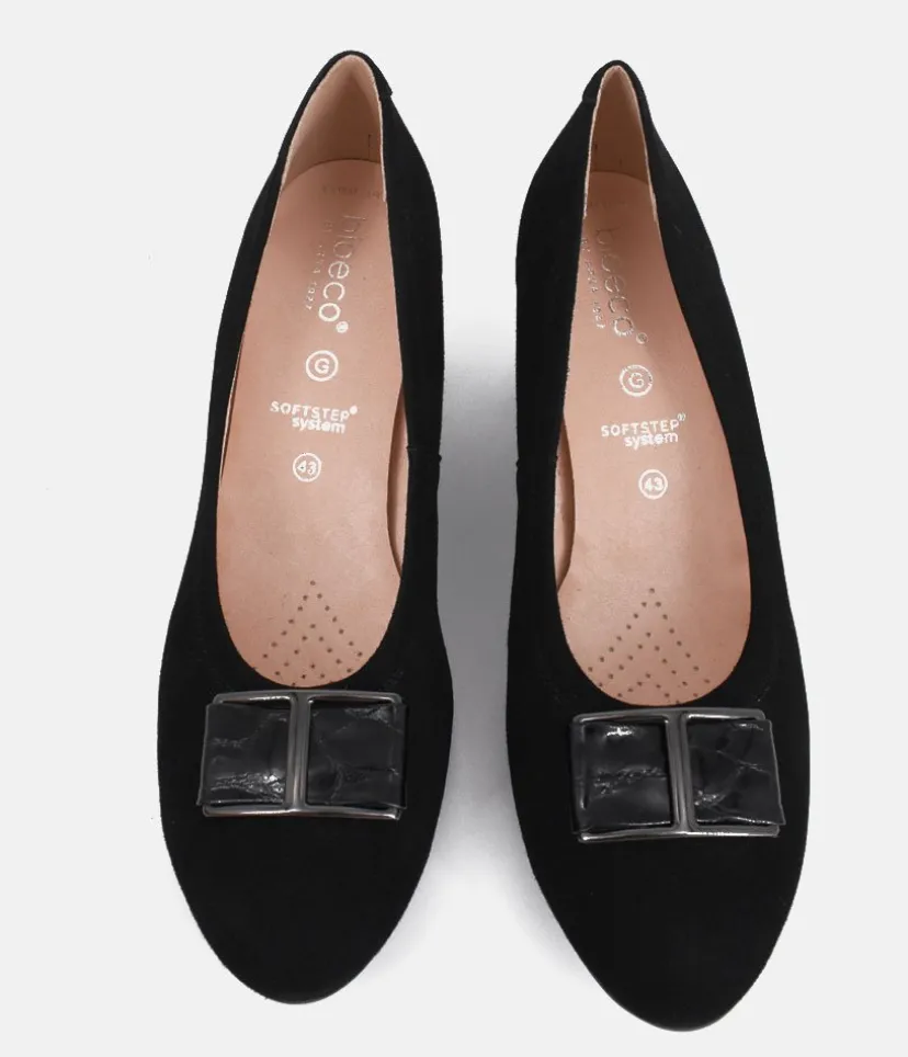 These Block heel shoes are a versatile addition to Your year-round wardrobe. Featuring a simple and classy silhouette in classic black with a decorative buckle on the upper to give it a stylish finishing touch. These heels have superb cushioining on the insole and will be a great choice for any occasion. Pair with this Bioeco Clutch.