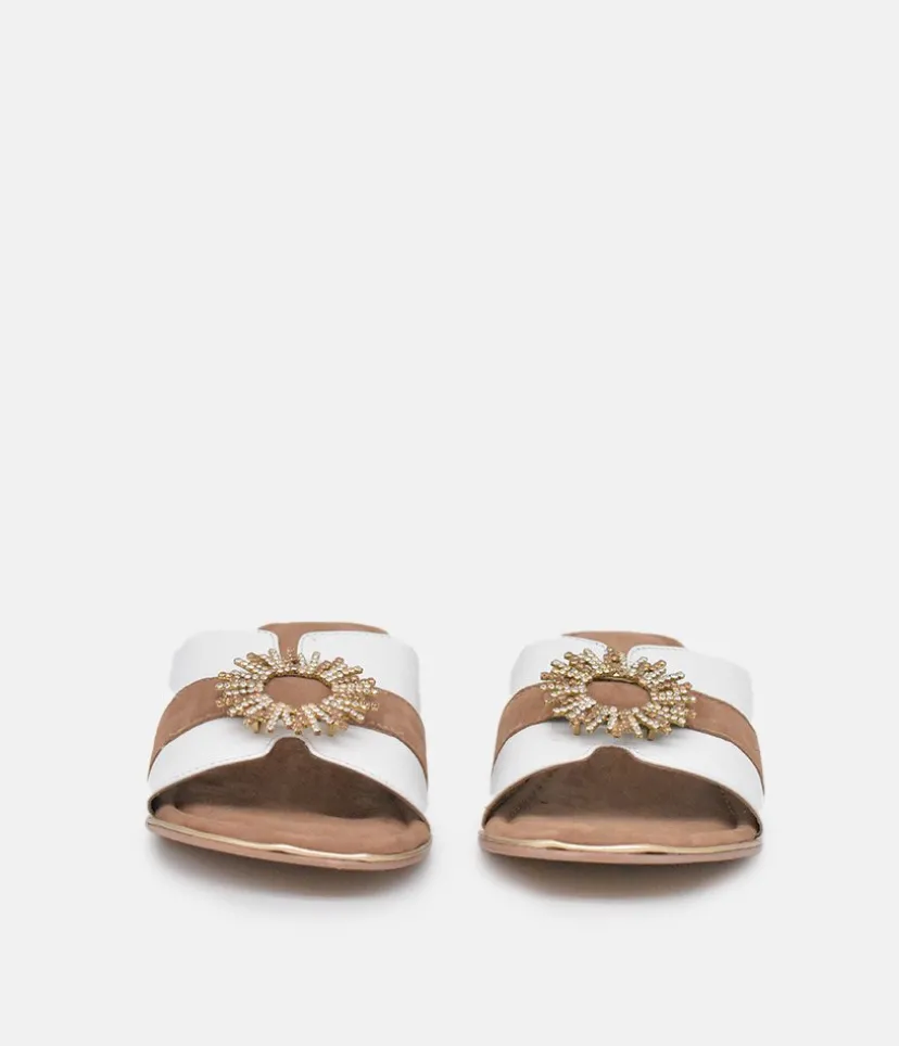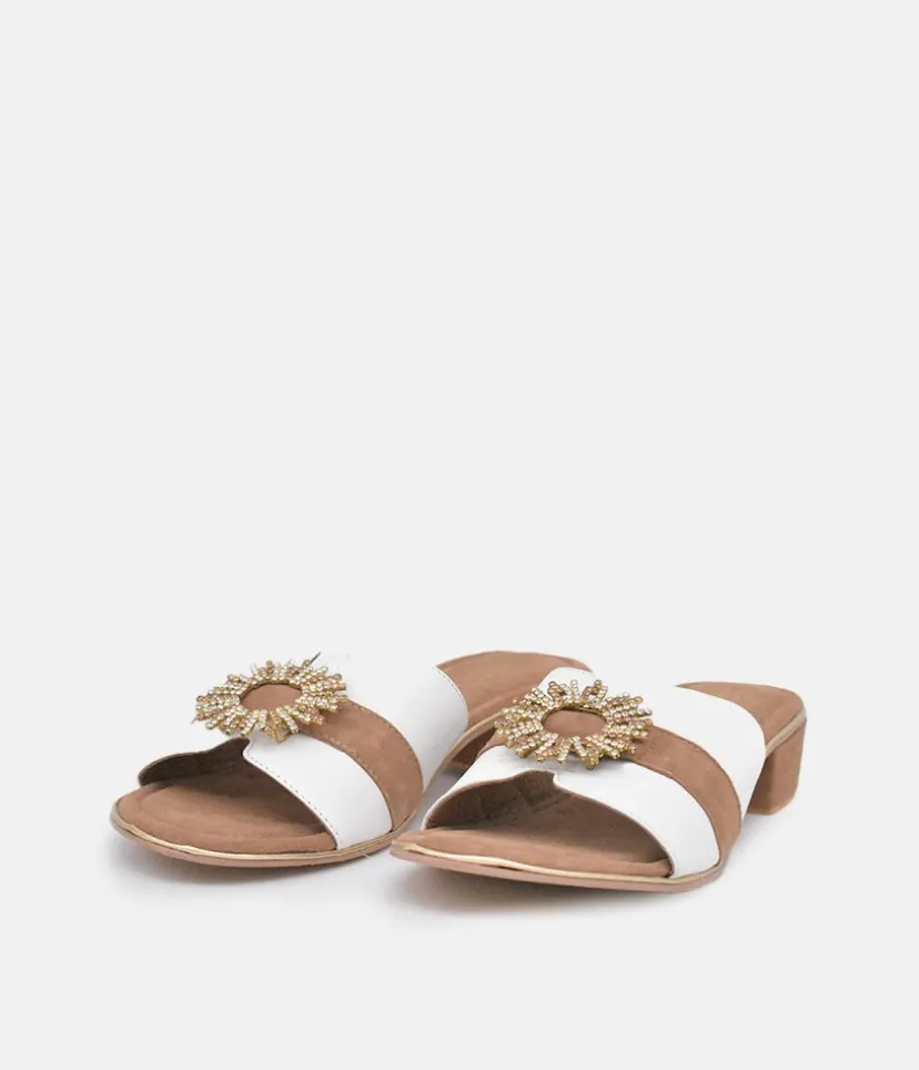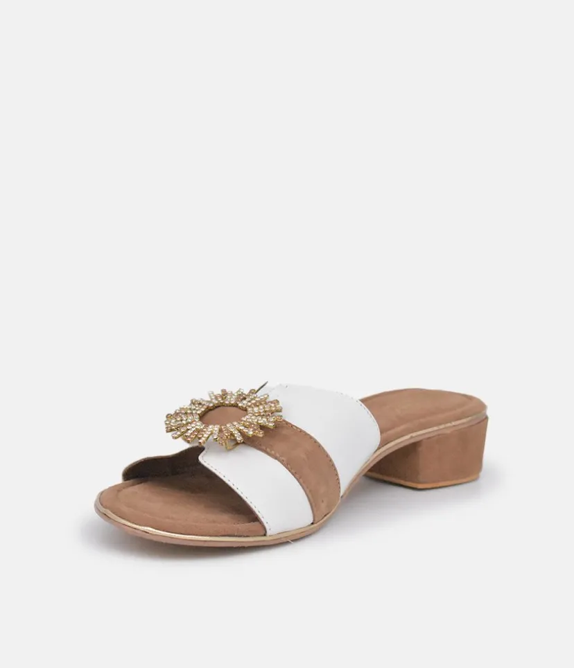 These Plush slip on Sandals are a stylish choice. Featuring a luxurious suede insole, leather and suede upper with an eye-catching circular embellishment and a Block Heel. Great to dress up or down an outfit and easy to pair with Jeans or dresses.