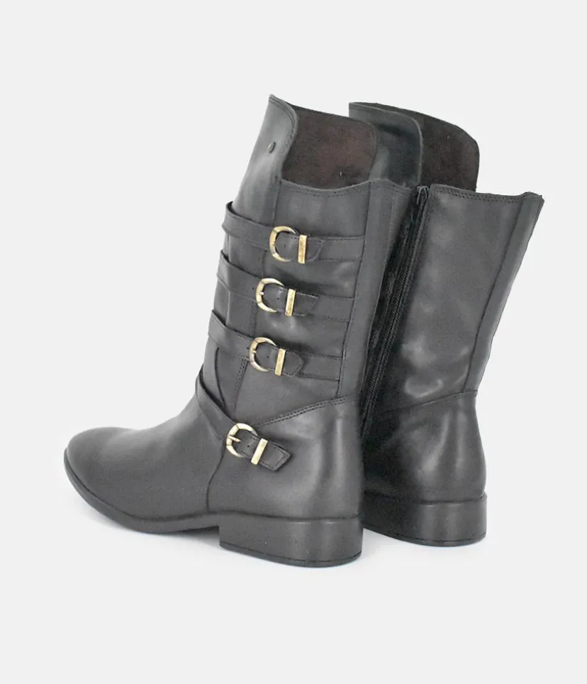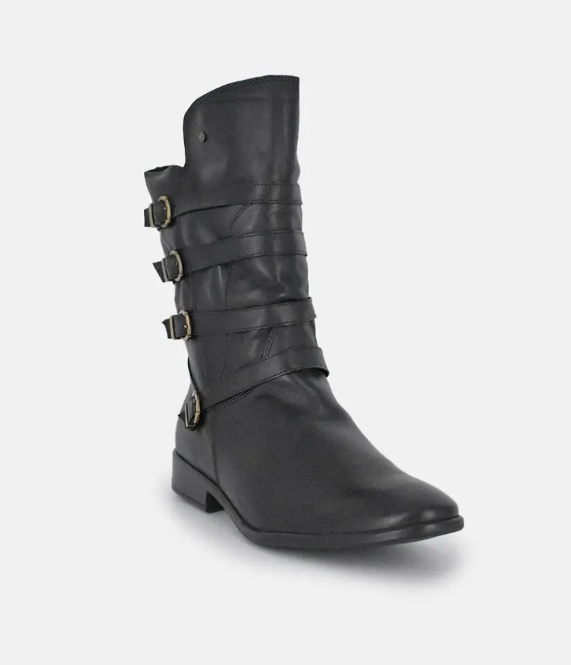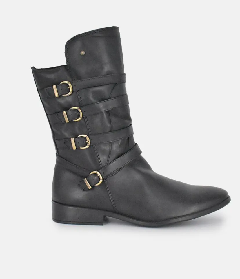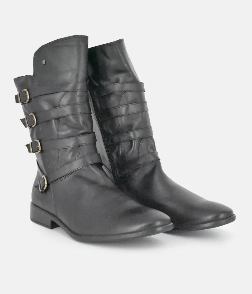 A Premium Leather Midi Boot with decorative buckle detailing on the upper. This styles fuses function with style and is perfect for the cooler days.