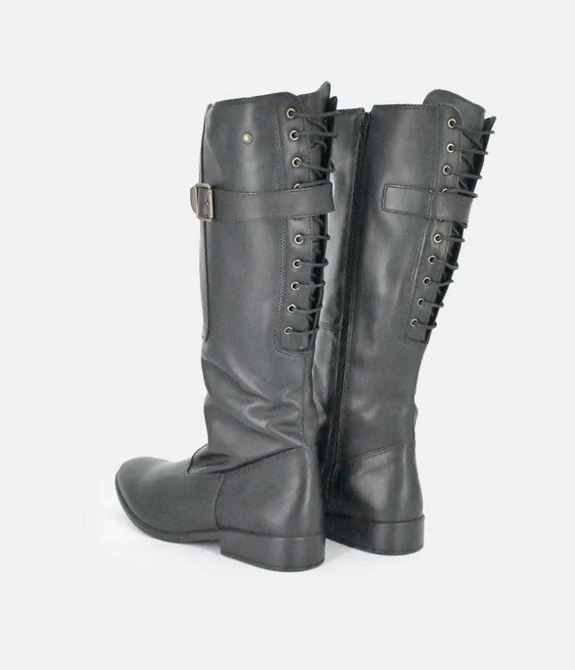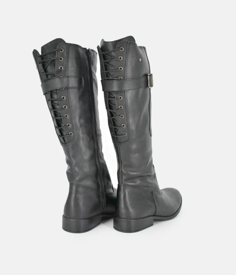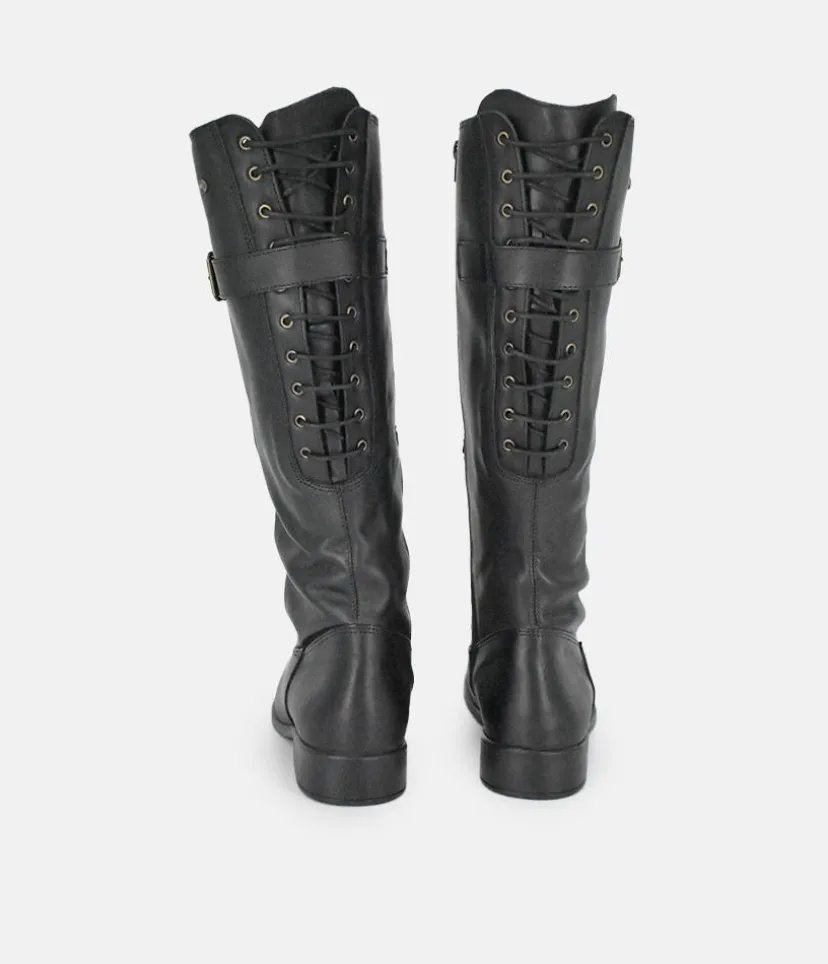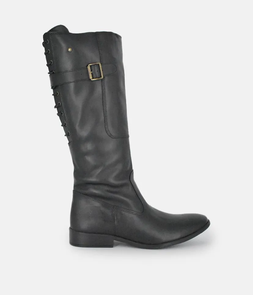 Give any look that extra something special with these long leather boots featuring decorative corset style lacing and buckle detail. A great choice for your wardrobe this season.