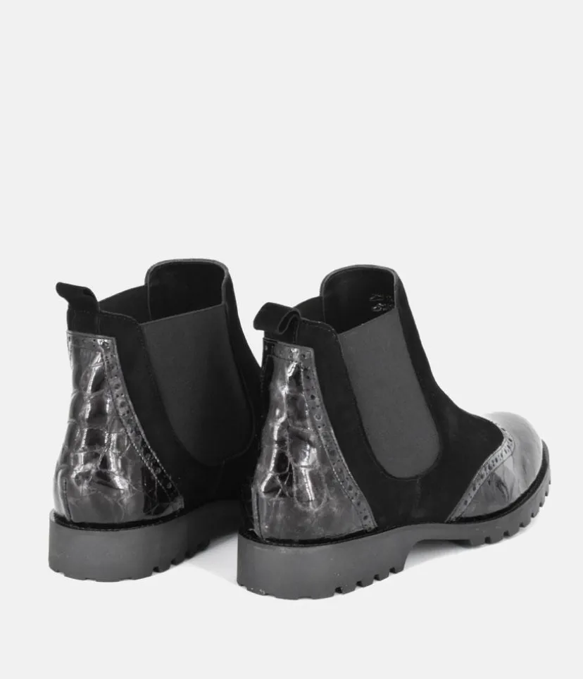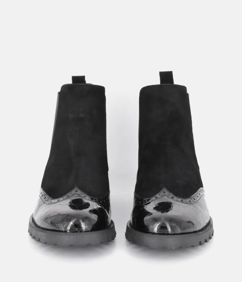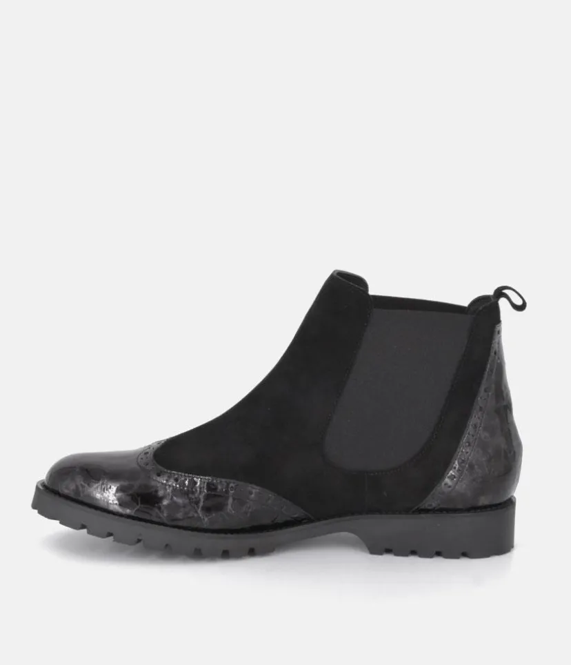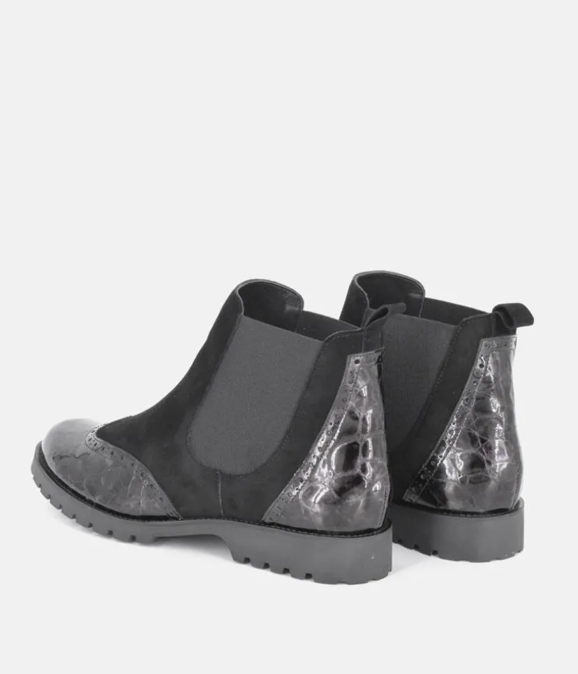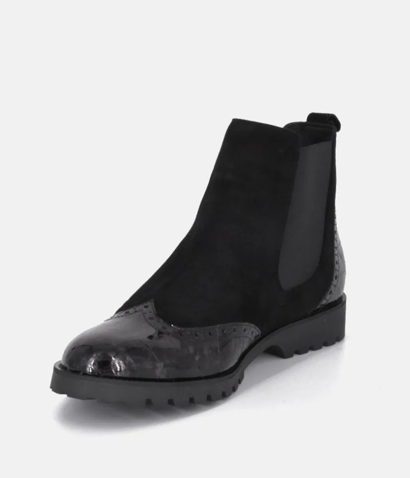 This is a Versatile and Stylish ankle boot from Cinderella Shoes with its combination of Suede and Patent with Brogue detailing with Chelsea style elastic side panels. A great style for your wardrobe this season.