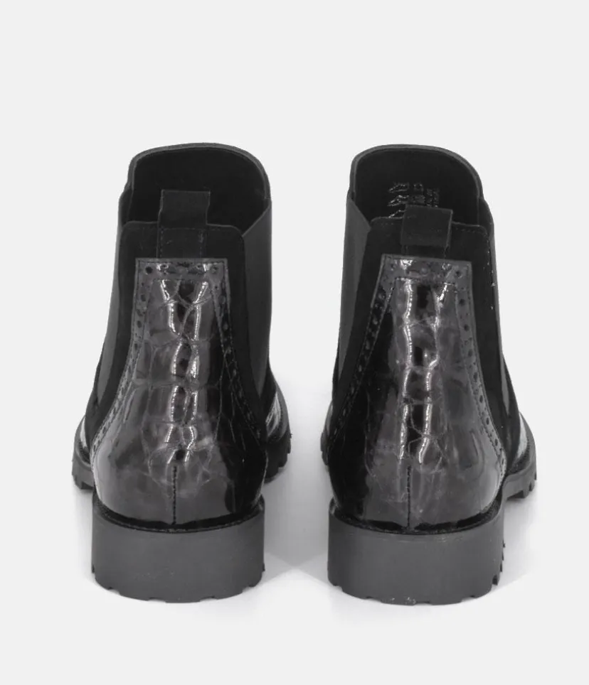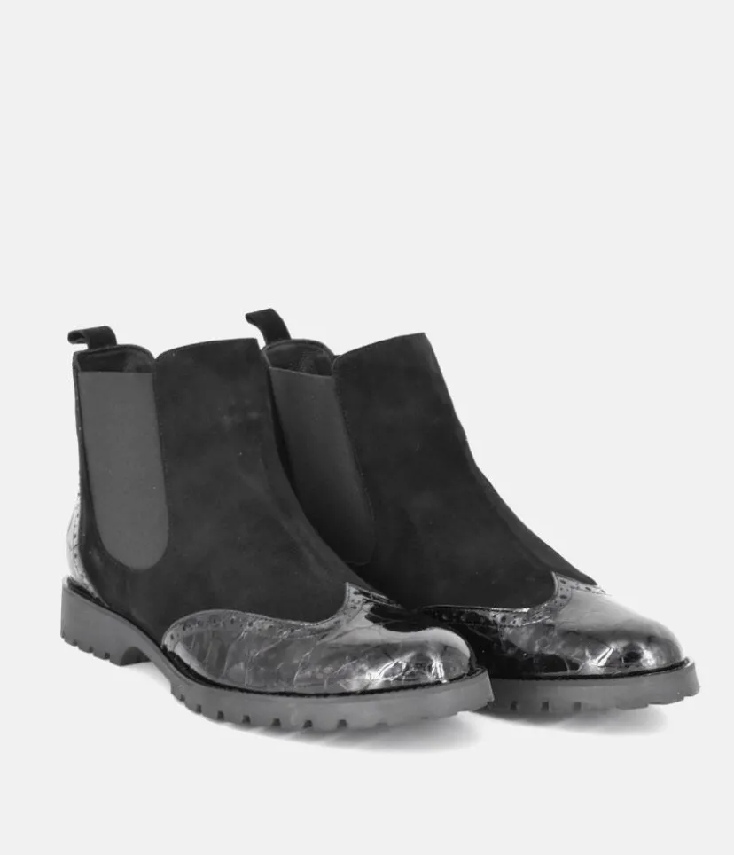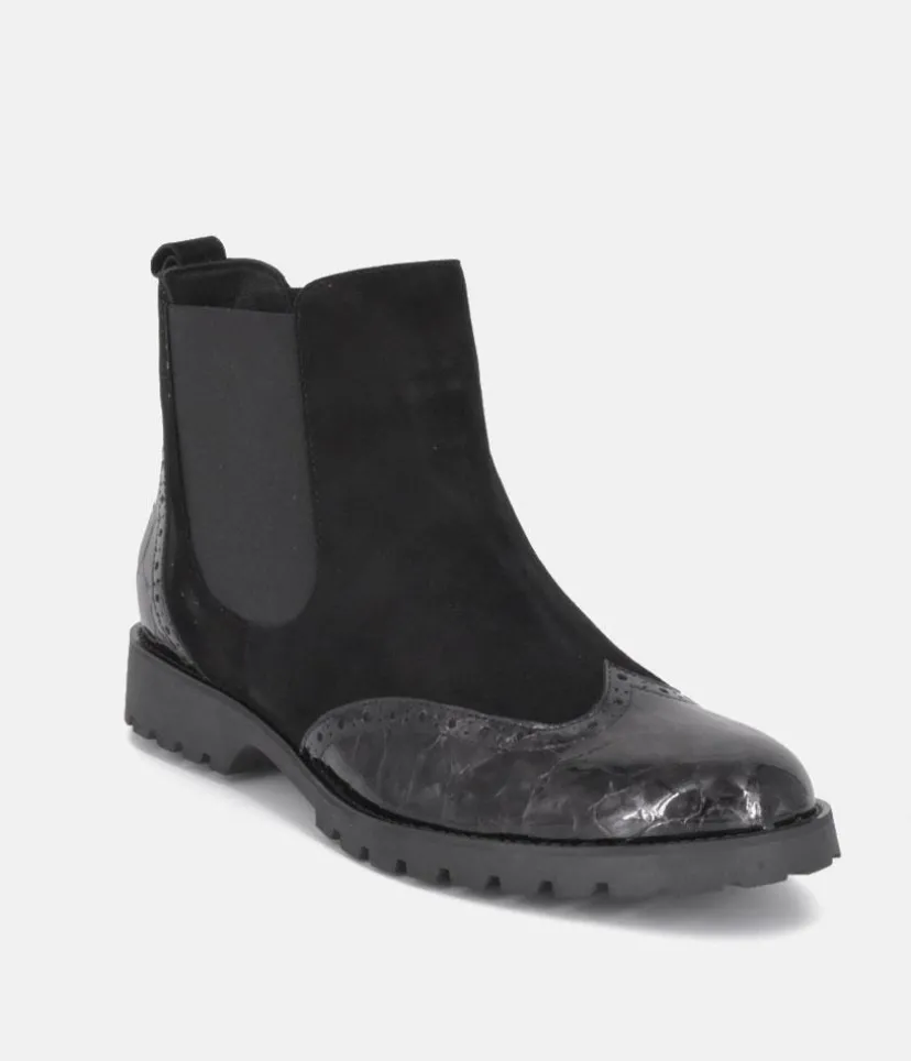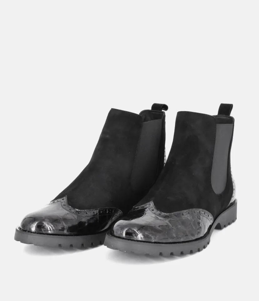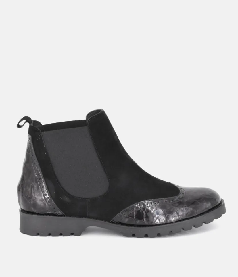 This is a Versatile and Stylish ankle boot from Cinderella Shoes with its combination of Suede and Patent with Brogue detailing with Chelsea style elastic side panels. A great style for your wardrobe this season.
