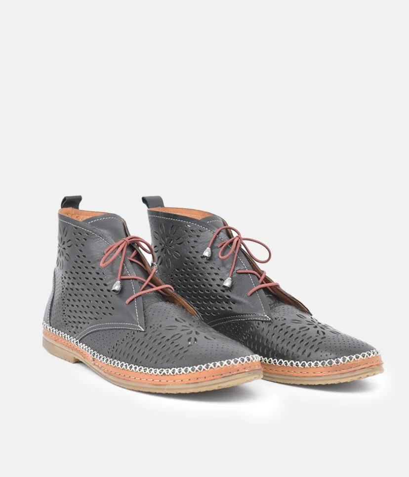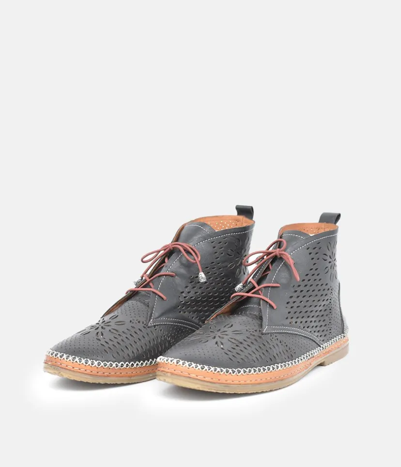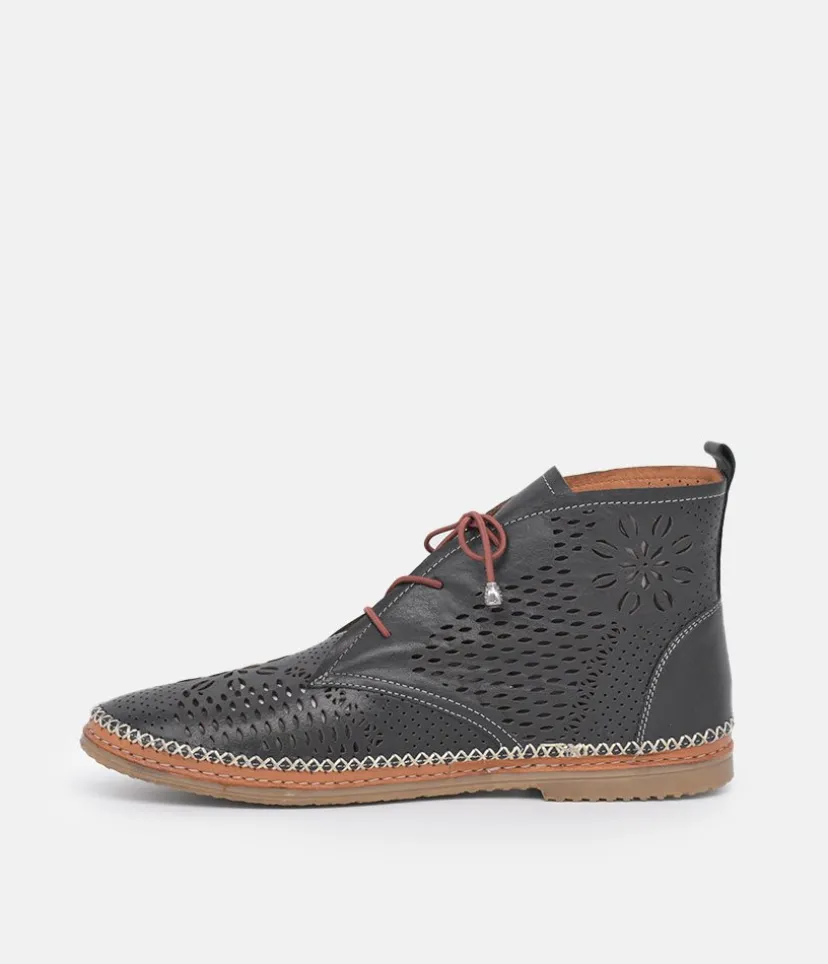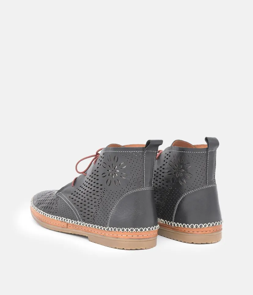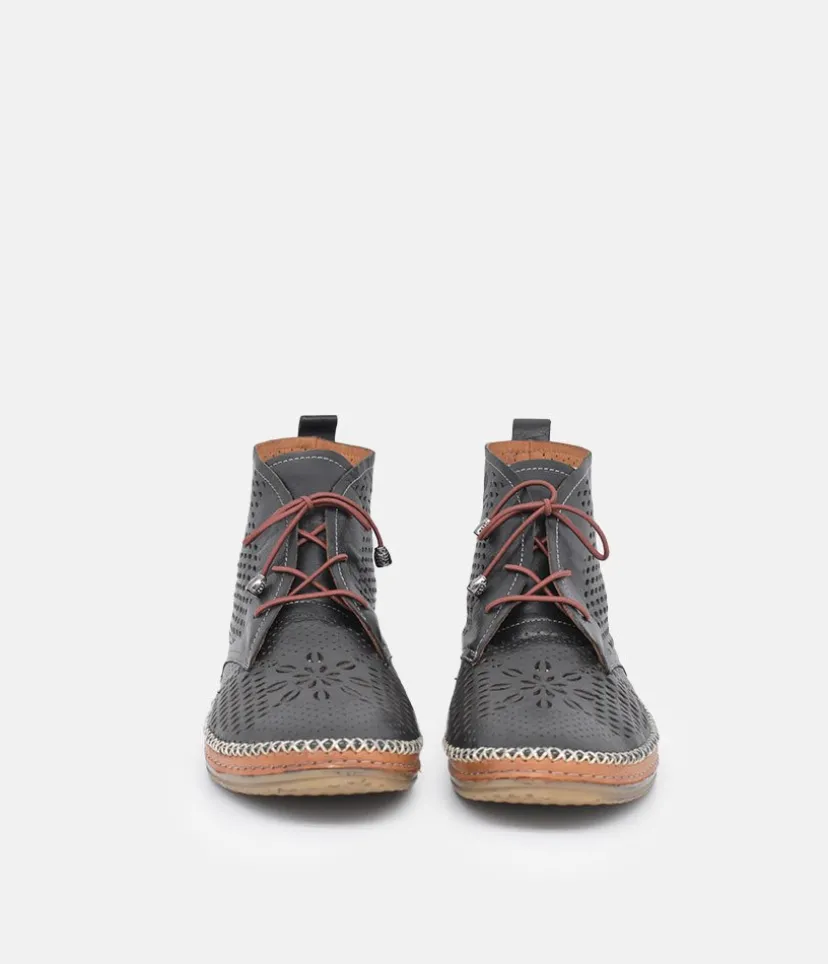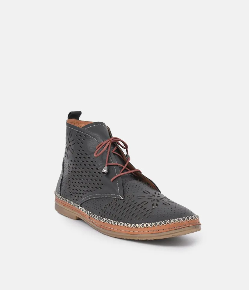 Step into these pretty lace up booties featuring a laser cut out patterned design.
