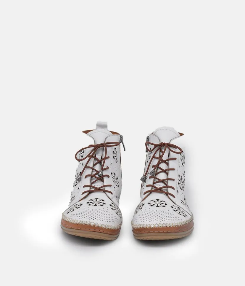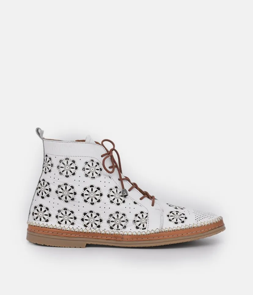 Step into these pretty lace up booties featuring a laser cut out patterned design.