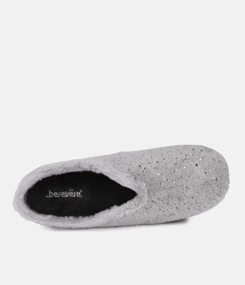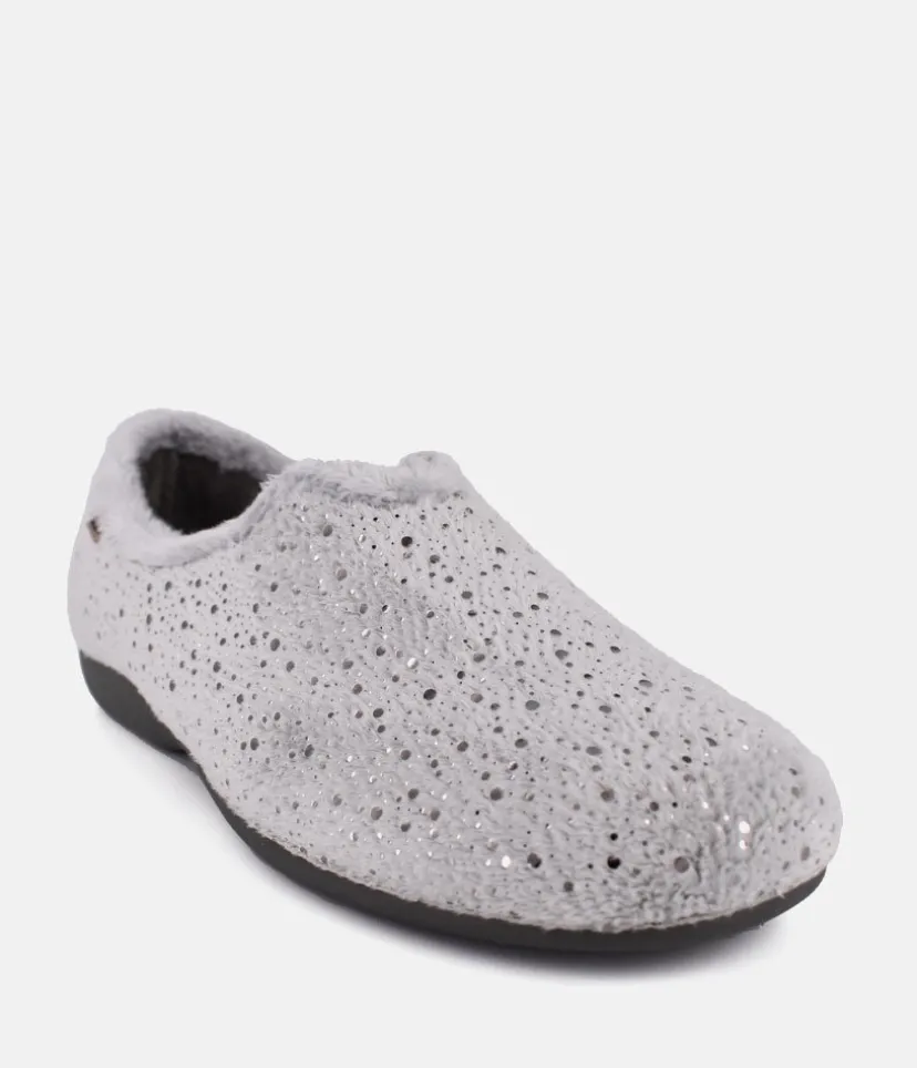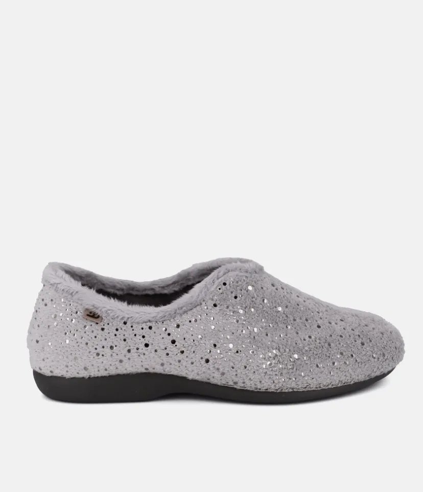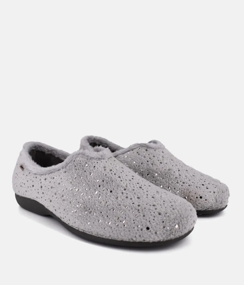 These are lovely cosy slippers and are very comfortable to wear with a Grey and Pretty Silver metallic pattern on the upper. Resistant and easy to maintain natural vulcanised rubber sole. A vulcanised sole is where the rubber has been made stronger and more durable.