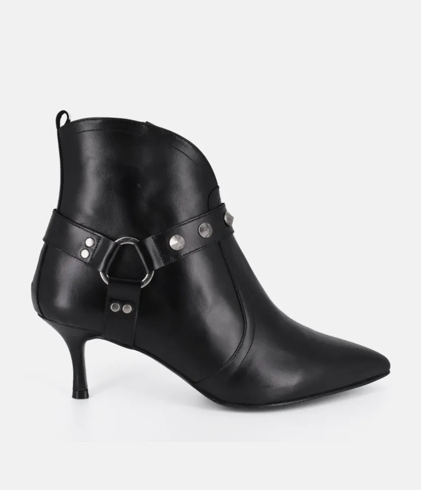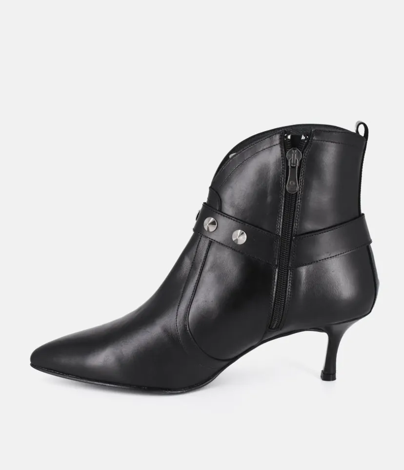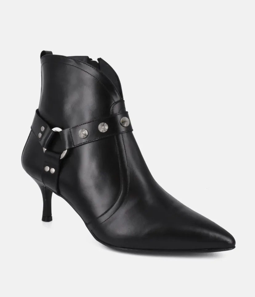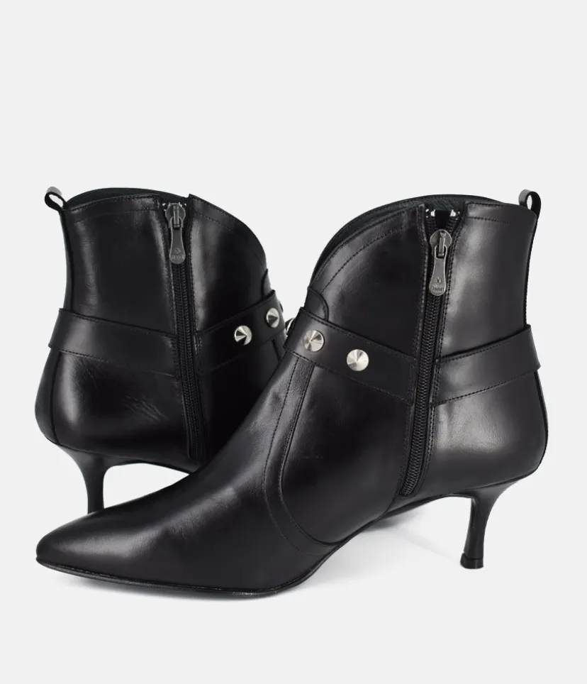 These Ankle Boots from Dansi in smooth black leather, combine a timeless design with modern details. This style is an ideal way to add effortless elegance to your wardrobe. The 6 cm heel height will give you a lift, while maintaining optimal comfort. The high-quality non-slip sole gives you unwavering stability with every step. This model is embellished with small silver jewels delicately arranged at the front and will bring a touch of glamor to your outfit, making every step you take shine!
