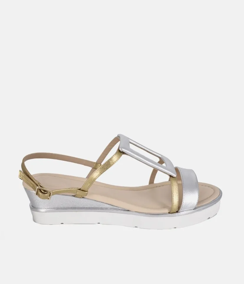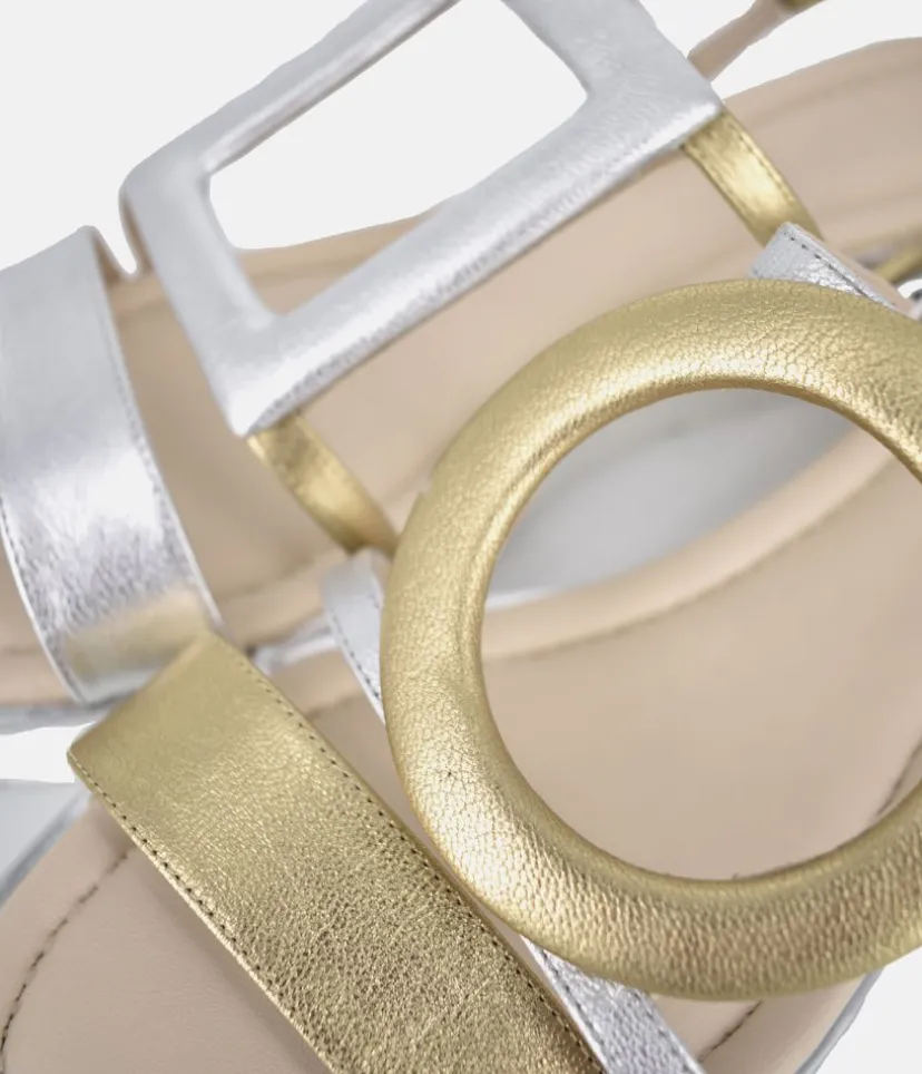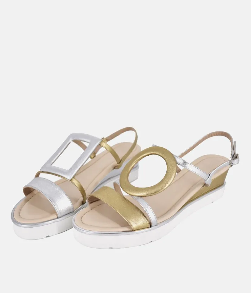 These Stunning wedge sandals from Dansi have a fabulous combination of Metallic Gold and Silver on the Upper. Crafted in Spain, they have contrasting designs on each pair making them a truly stunning style to add to your Summer wardrobe. Opposites most definitely attract in this New Season Collection from Dansi. This range encompasses a stunning array of fashion forward statement styles in bold designs featuring Circles and Squares on each pair of footwear.