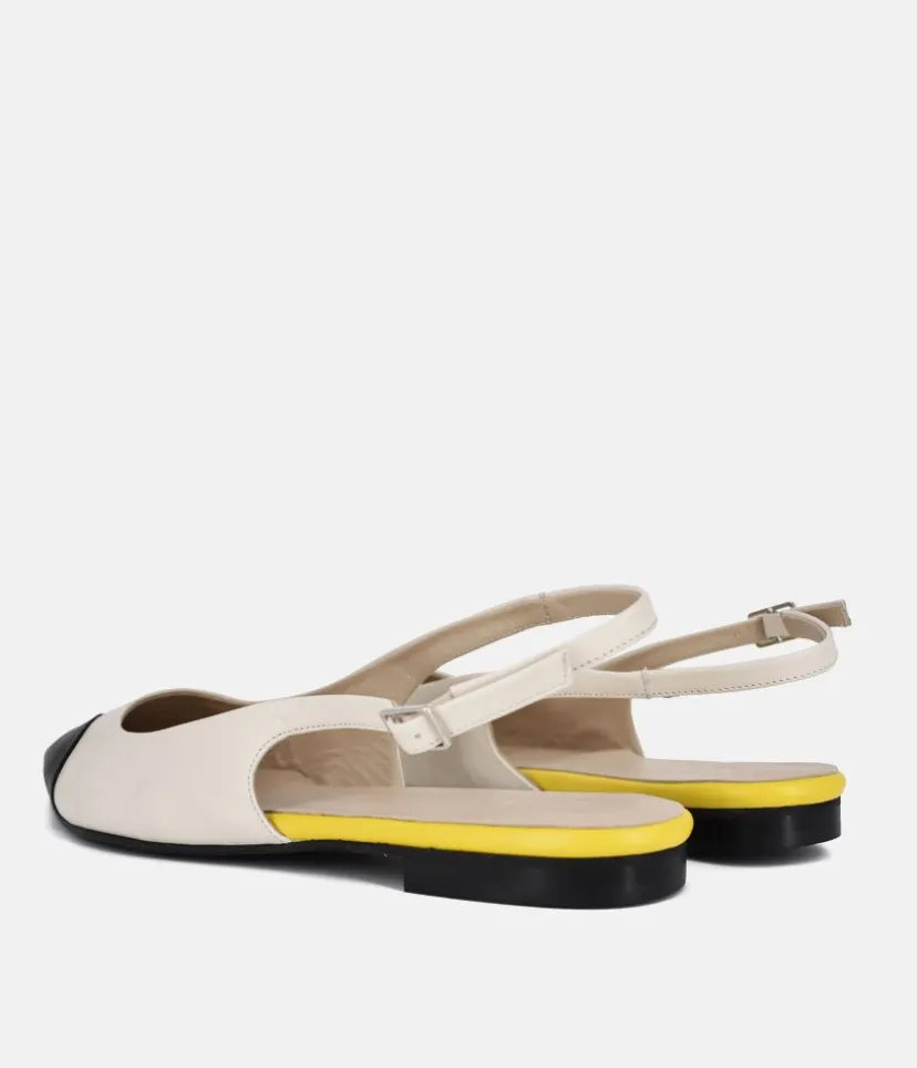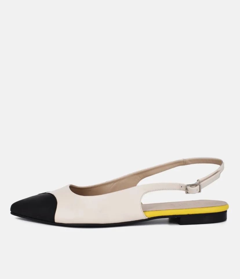 Classic flats get a sophisticated revamp with this gorgeous slingback style in a striking combination of Cream, Black Toe and Yellow trim on the upper. Slingback flats are the go-to solution for the changing seasons, a contemporary fashion hybrid between closed ballet flats and open sandals. Crafted in Spain, this style is a fresh alternative to classic heels for special occassions with it’s beautiful design, pointed toe, and low 1 inch heel.