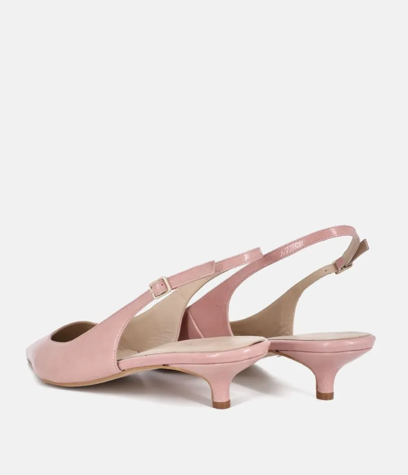 A Chic and classic style; these low heels by Dansi feature an upper made of smooth Pale Pink Patent leather. Crafted in Spain, they have a pointed toe, an elegant slingback style with a Kitten heel. Wear them with a suit or your favourite dresses for any special occassion.