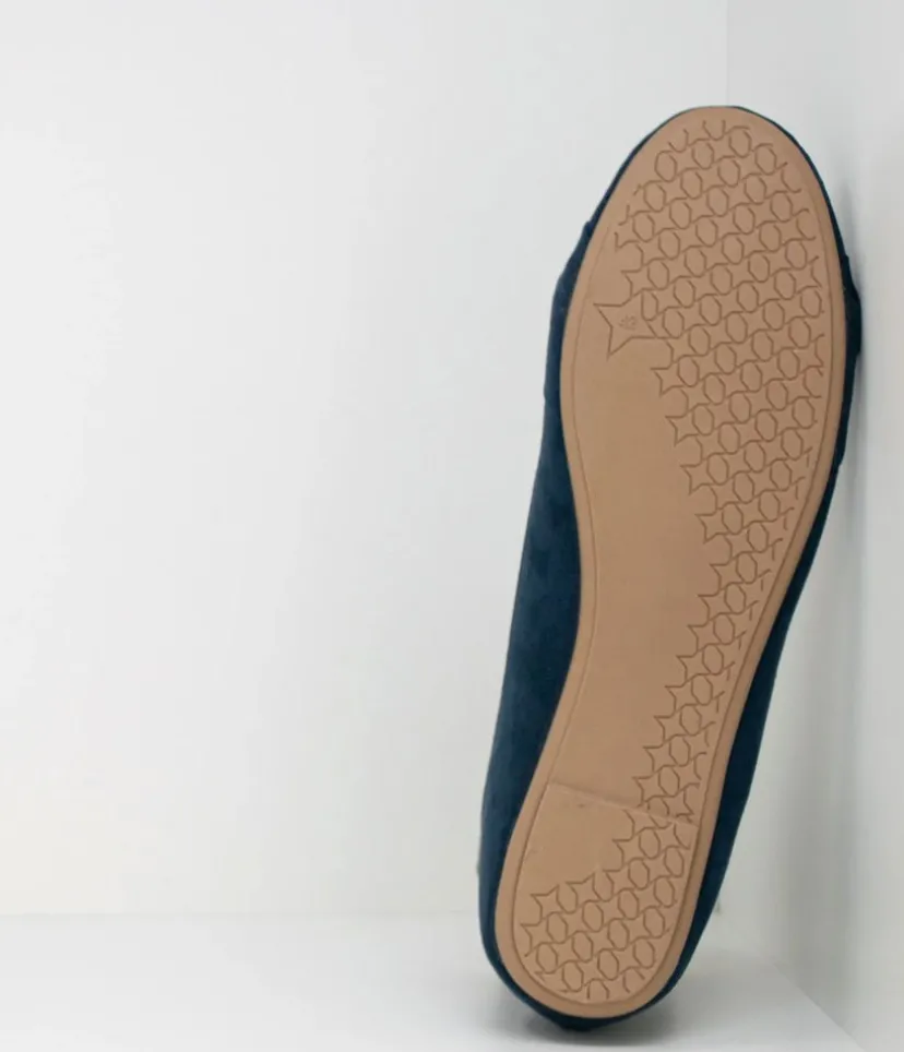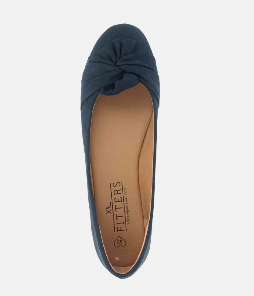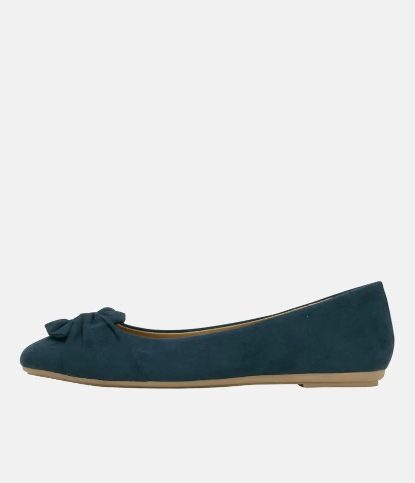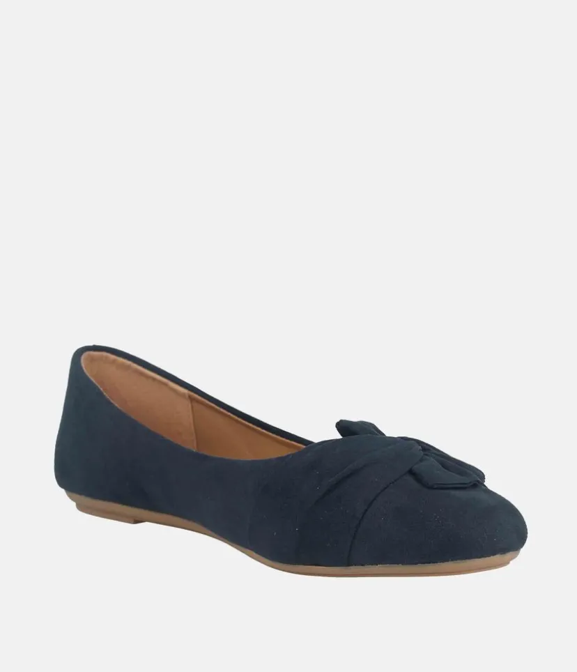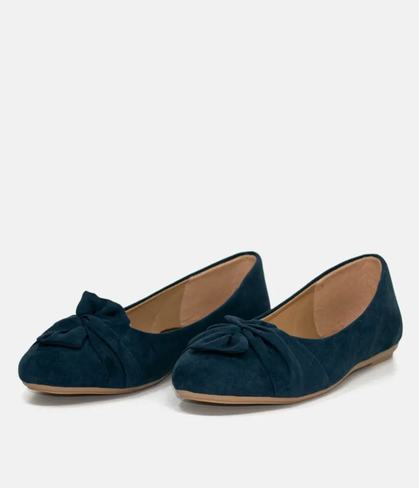 A Classic Pretty Ballerina style with a faux suede upper finished to perfection with a knotted bow detail. These Navy ballet pumps are not only stylish but also versatile, ensuring you’re always ready for any occasion. These Ballet flats have a round toe, and a classic silhouette that maintains a timeless appeal. Crafted in a versatile Navy, these flats lend themselves to a myriad of styling options. Perfect for pairing with neutral outfits, these shoes are the ideal companion for creating effortlessly chic looks.