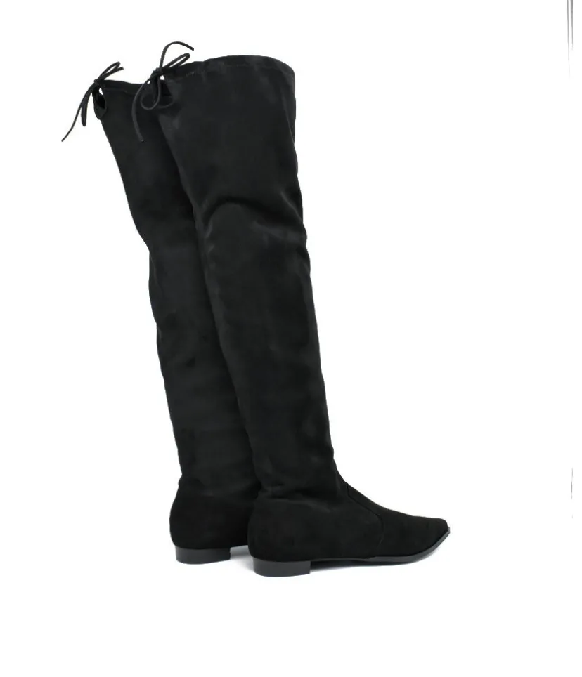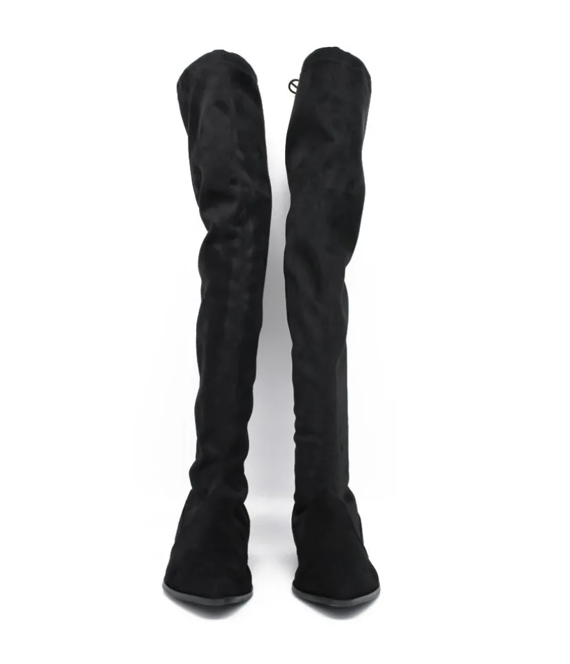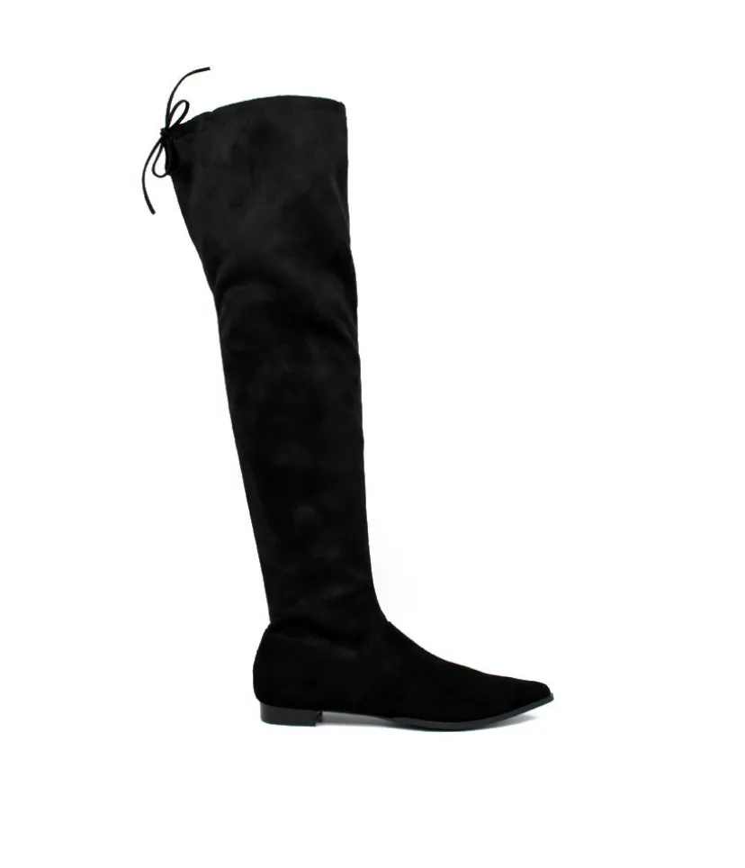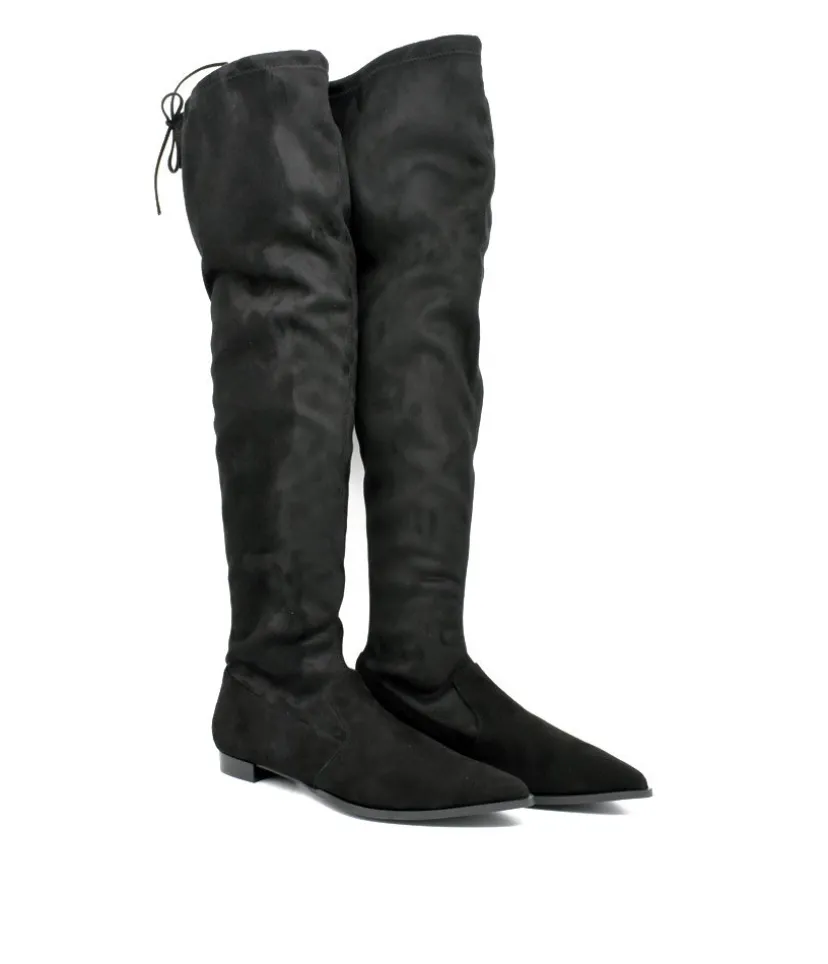 Create a striking silhouette in these Premium Suede over-the-knee boots. Pull-on style, with a soft pointed toe, and tie closure at back. These boots are handmade for Cinderella Shoes in Spain. Warm and chic, these make for a wardrobe staple.