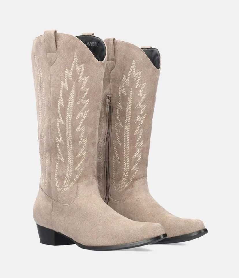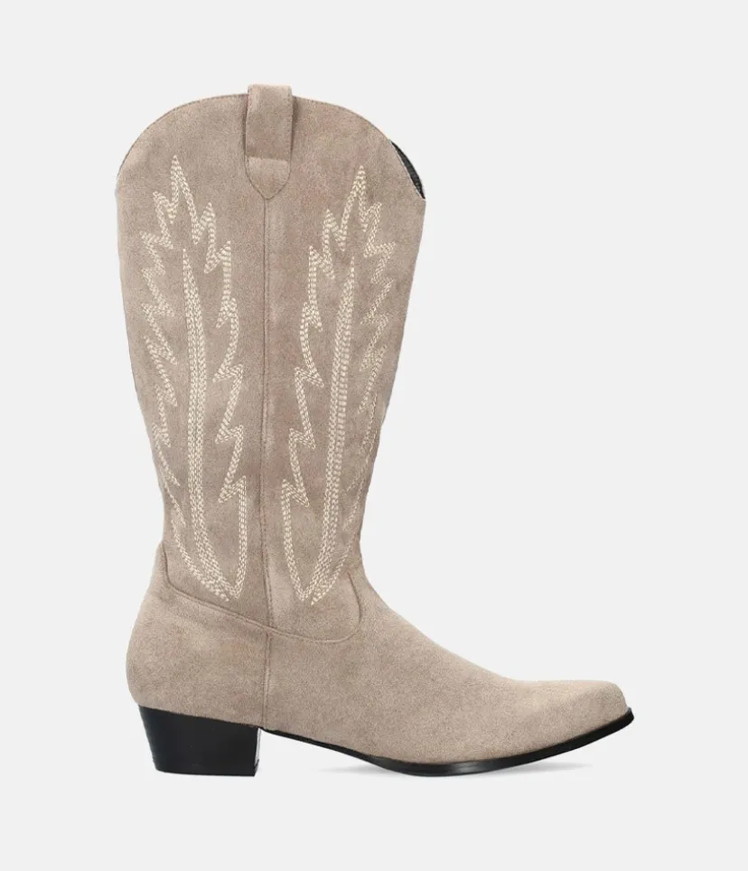 A Classic suede midi boot with western style pattern; these boots are a versatile and stylish addition to any wardrobe. An easy to wear style featuring a contoured silhouette with tabs to the top-line, a low stacked, almond toe and inside Zip.