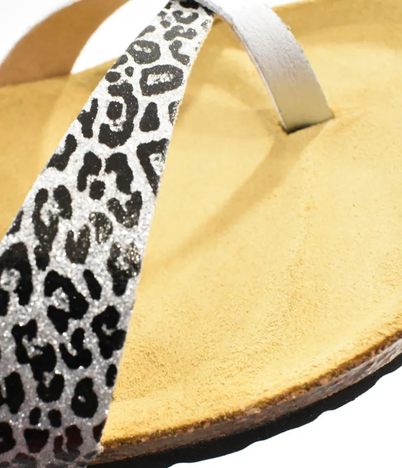 This modern thong sandal stands out with it’s combination of Metallic Silver and Leopard Print Straps. The contoured cork footbed ensures a very comfortable fit. A great style perfect for holidays!