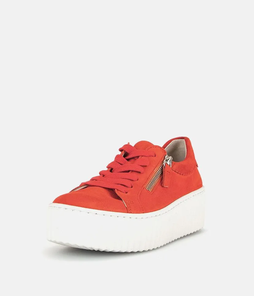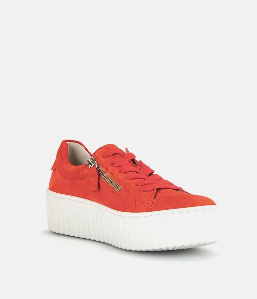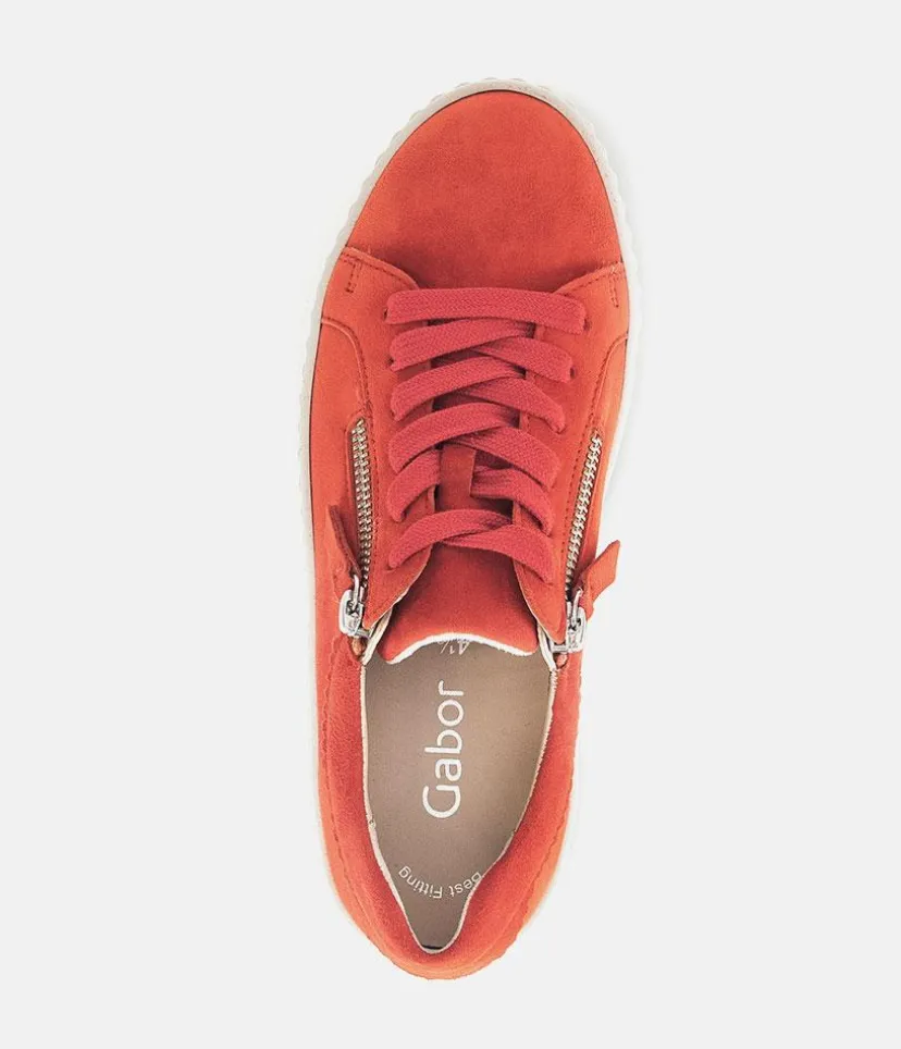A Trendy Pop of colour from Gabor with this Orange lace up Trainers. The chunky outsole has stylised grooving for a textured finish. A fantastic versatile style to have in your wardrobe that can be worn with a wide variety of looks and outfits. The trainers are lined with leather and textile that cushions feet for a comfortable fit. Finished with Soft Nubuck leather uppers in a lace up design complete with two side zips for a more secure fit.