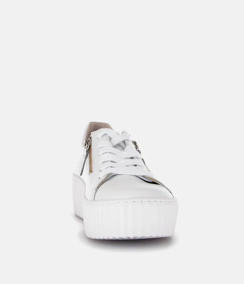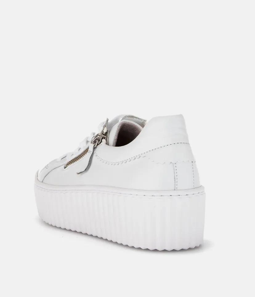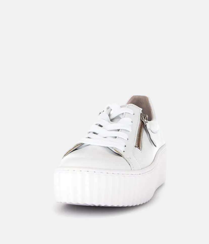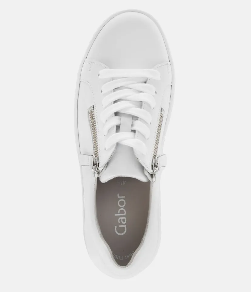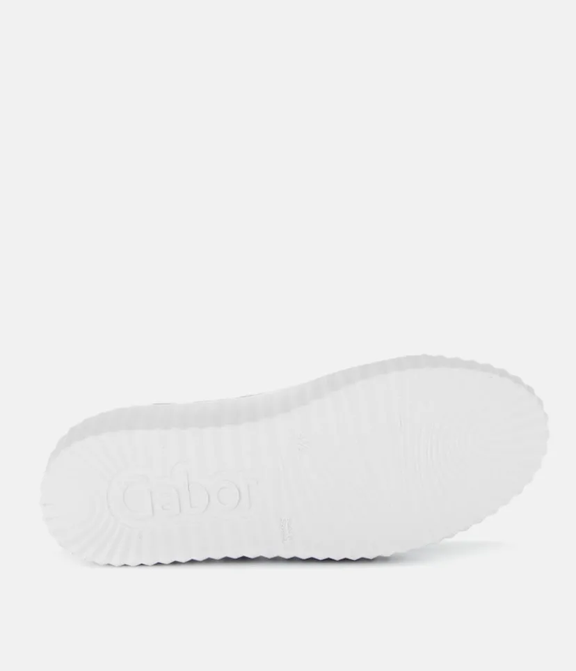 A Classic Style from Gabor with this new White Leather lace up Trainer. The chunky outsole has stylised grooving for a textured finish. A fantastic versatile style to have in your wardrobe that can be worn with a wide variety of looks and outfits. The trainers are lined with leather and textile that cushions feet for a comfortable fit. Finished with Soft Nubuck leather uppers in a lace up design complete with two side zips for a more secure fit.