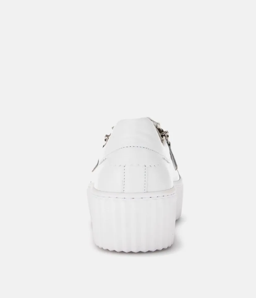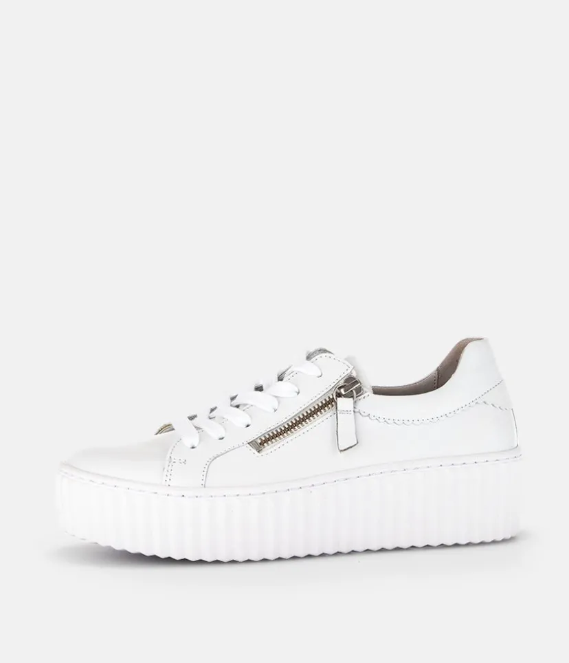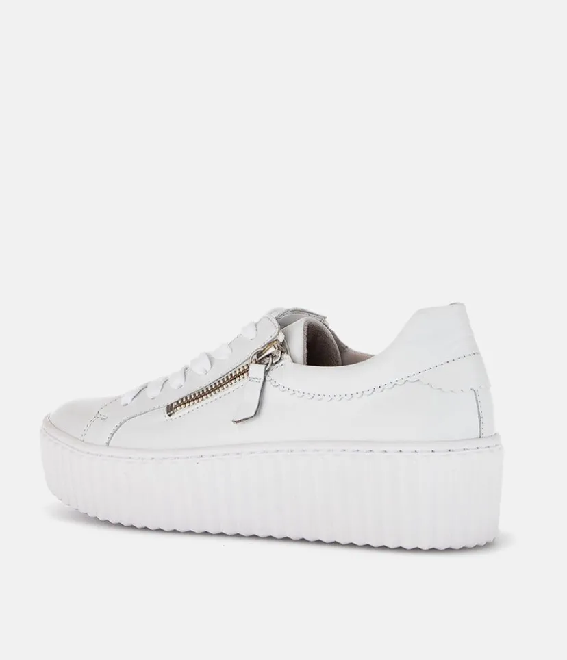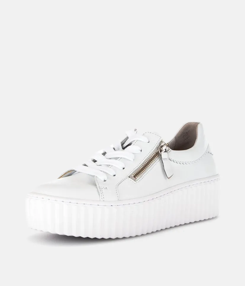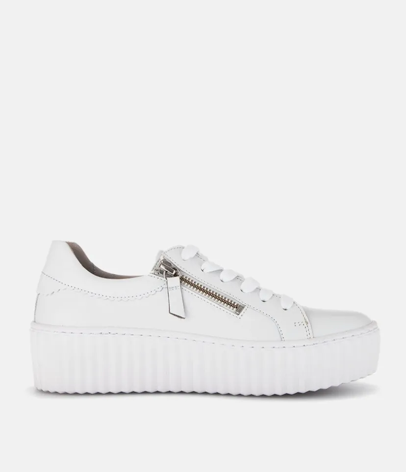 A Classic Style from Gabor with this new White Leather lace up Trainer. The chunky outsole has stylised grooving for a textured finish. A fantastic versatile style to have in your wardrobe that can be worn with a wide variety of looks and outfits. The trainers are lined with leather and textile that cushions feet for a comfortable fit. Finished with Soft Nubuck leather uppers in a lace up design complete with two side zips for a more secure fit.