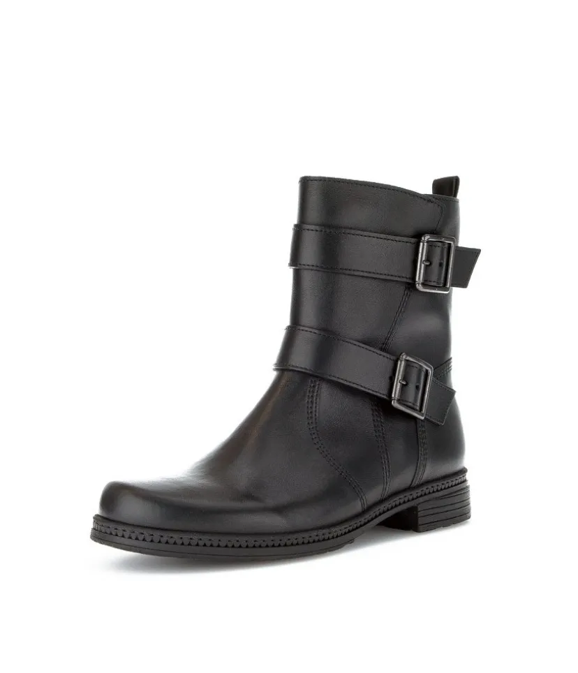 Release your inner rock chick with these biker style boots from Gabor. The black leather uppers are completed with buckle and strap detailing, featuring a side zip for easy on and off. On the inside a super soft lining and removable insole are perfect for keeping feet warm during the winter months. The ultimate in style, this classic silhouette wears effortlessly with denim or dresses.