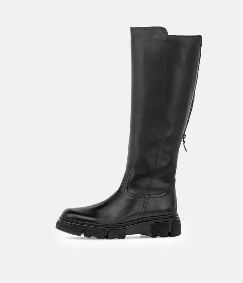 This is a Gorgeous Long Black Leather Boot from Gabor with an on trend chunky sole adding a modern twist. This boot features a full-length zip on the inside and in addition the boot features a zip at the back to offer a Vario width which helps you achieve an optimal fit.. Part of Gabor’s Best Fit range this boot offers a wider stepping surface in the ball area of your foot, allowing for more movement of your toes.