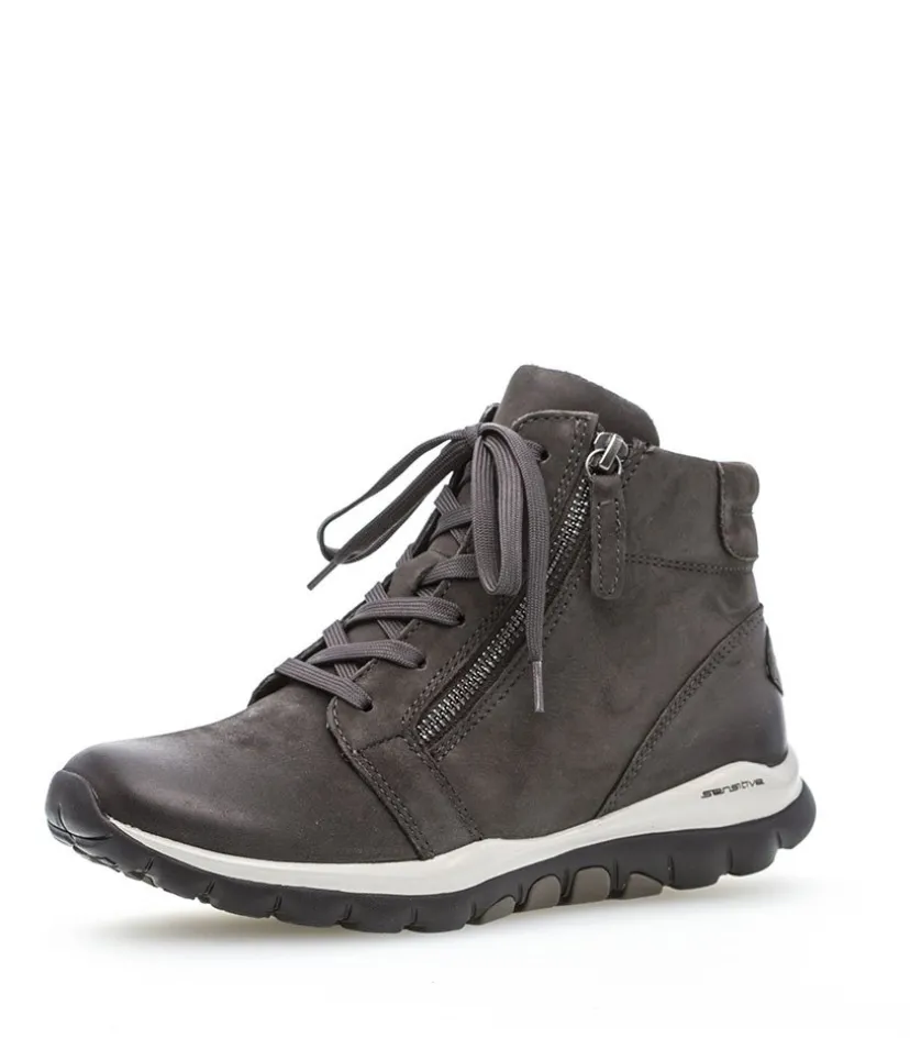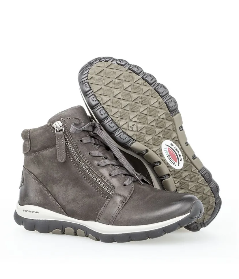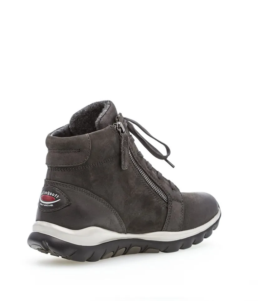 A Modern sporty sneaker bootie from Gabor, incorporating Gabor’s ‘Rolling Soft’ technology. High quality greased Nubuck with contrasting white on the sole. With rollingsoft, Gabor has developed shoes that not only look fashionable but can also do something for your well-being with every step you take. The result: a comfortable, modern shoe with a roll-over effect that can improve posture both when walking and standing.