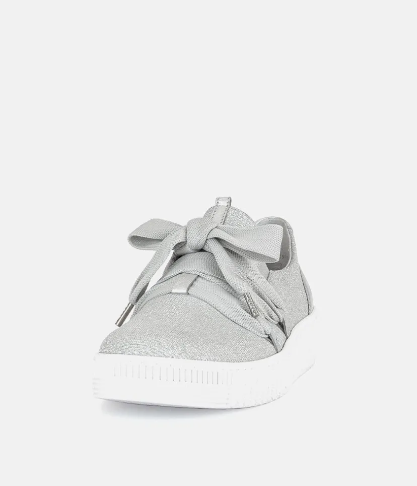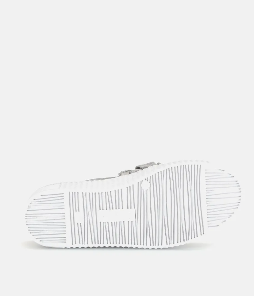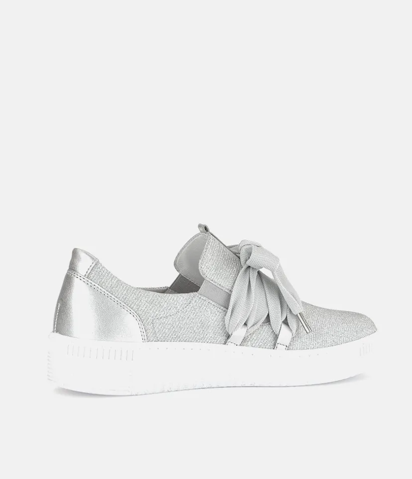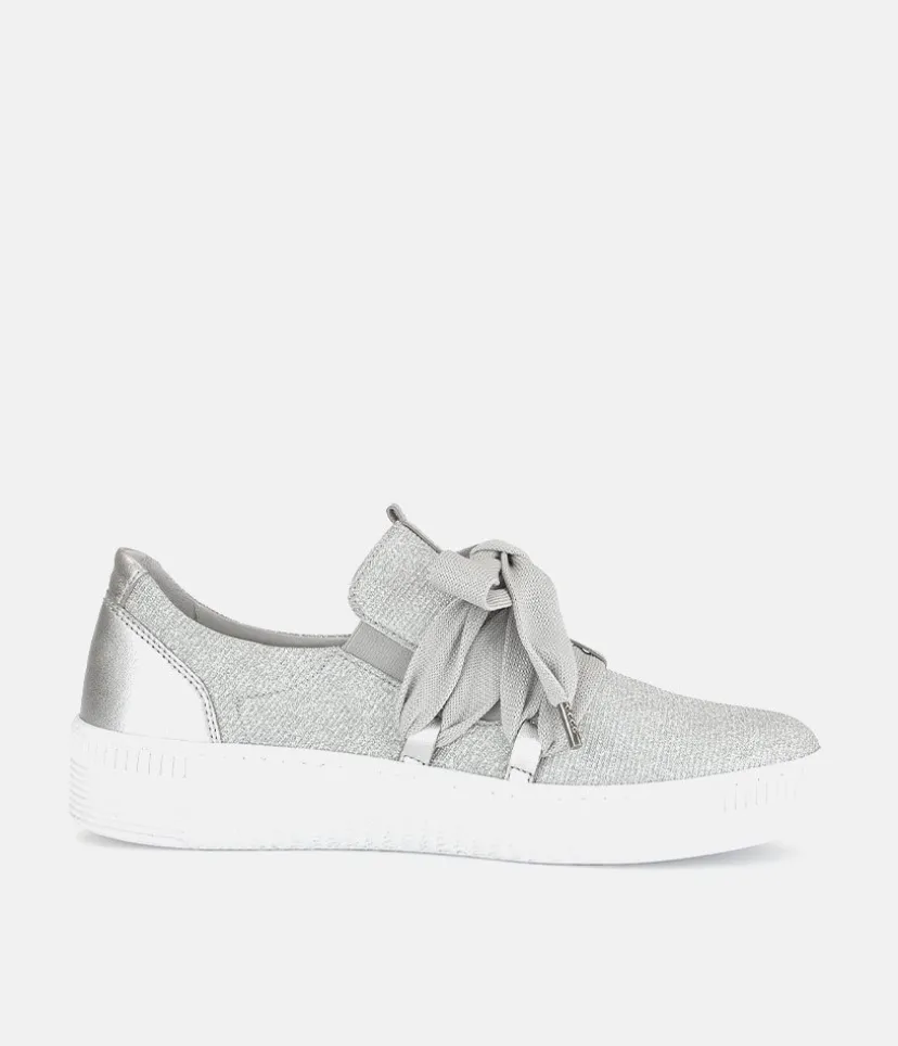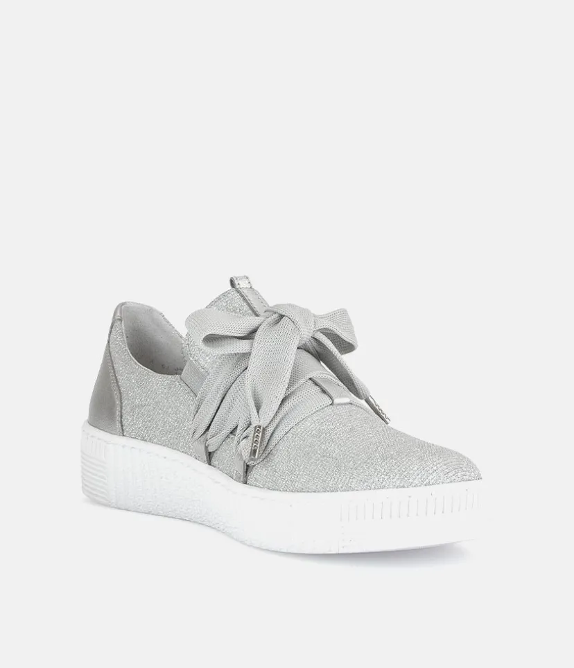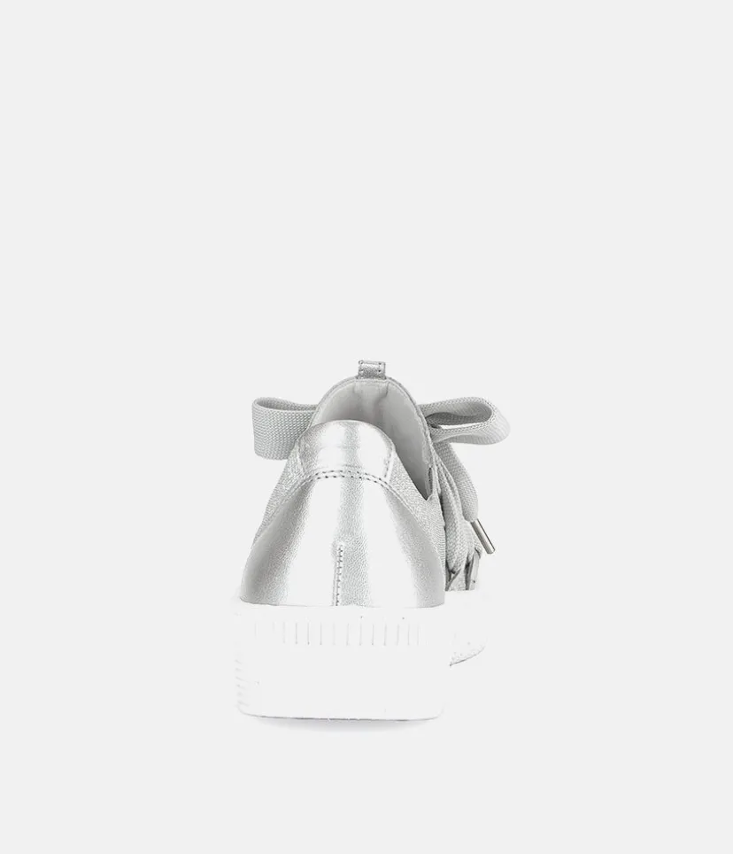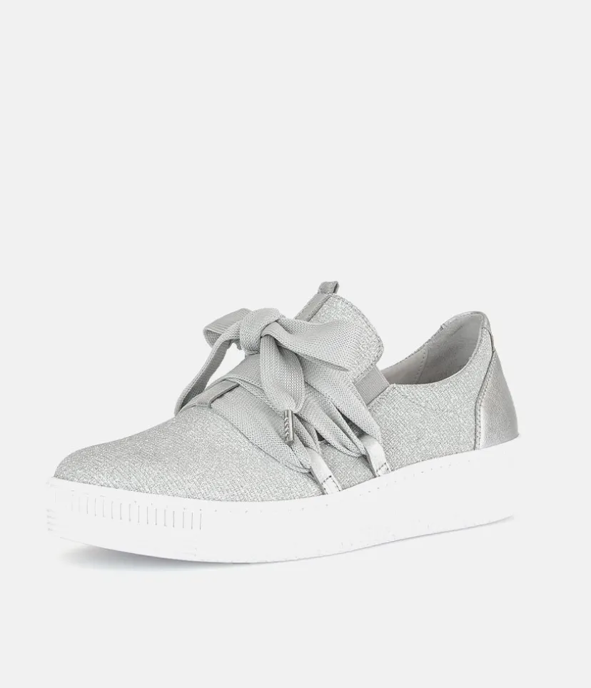 A Stylish Silver Slip on Style from Gabor with a chunky outsole featuring stylised grooving for a textured finish. A fantastic versatile style to have in your wardrobe that can be worn with a wide variety of looks and outfits. The trainers are lined with smooth leather and textile that cushions feet for a comfortable fit.