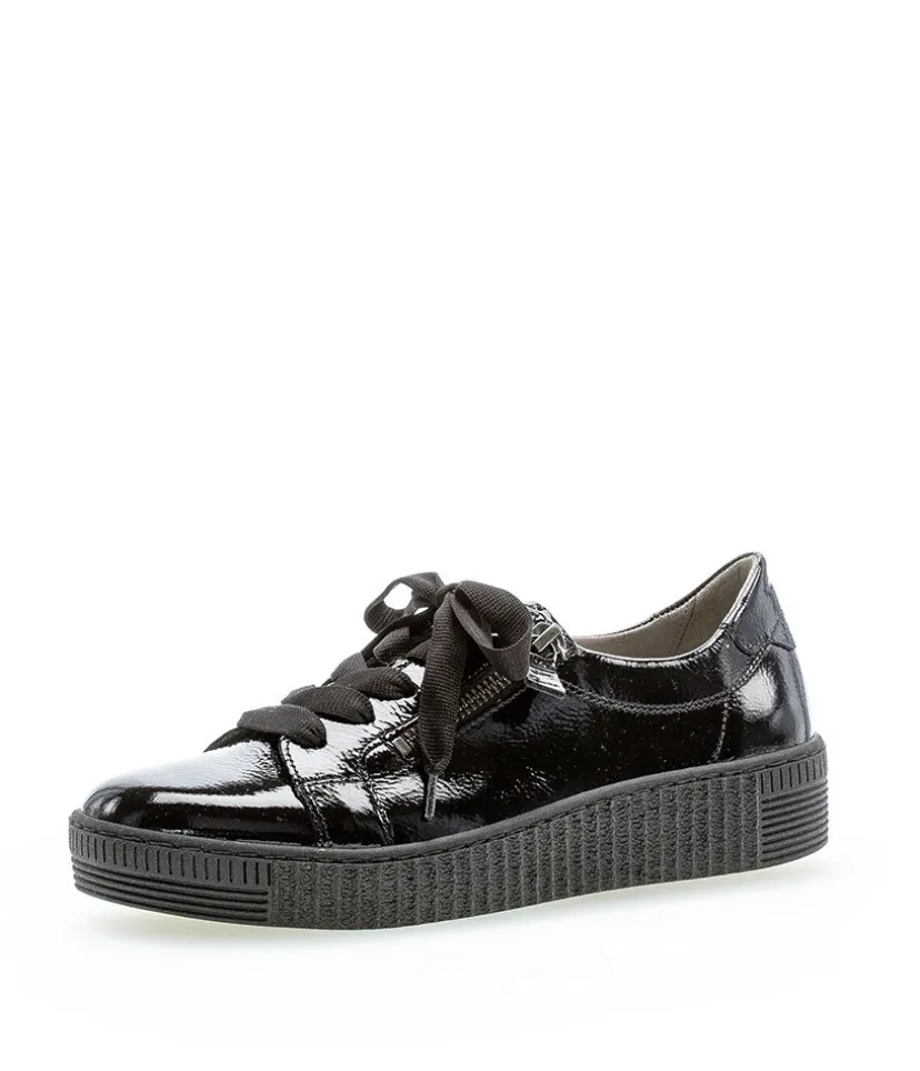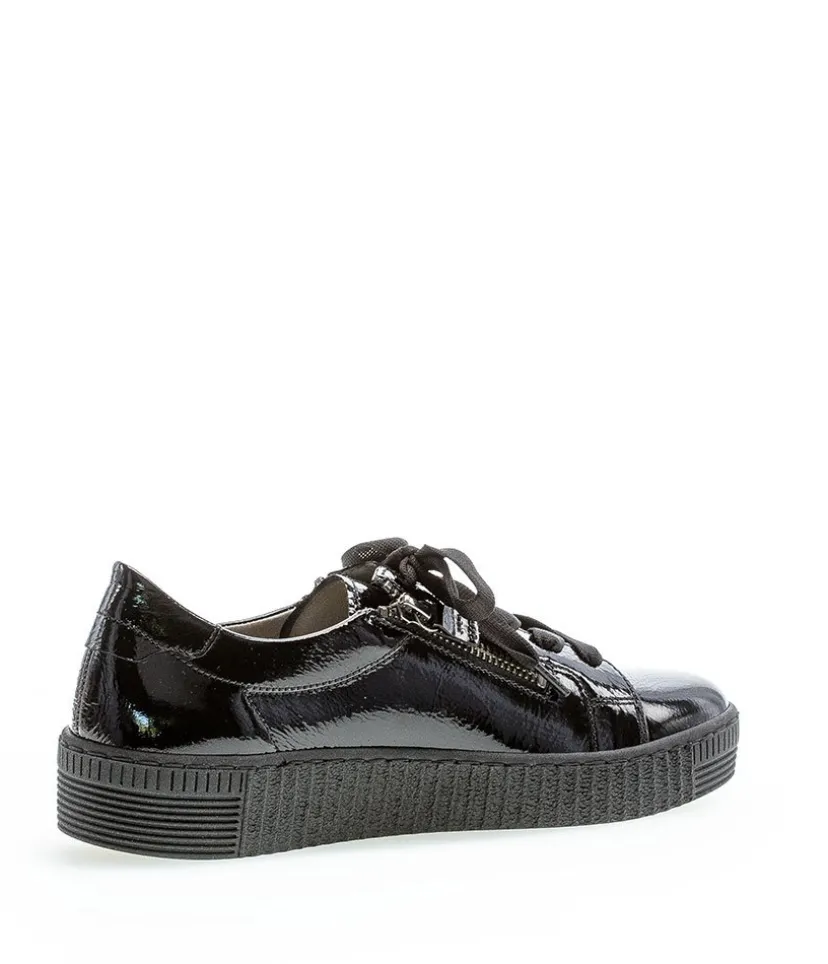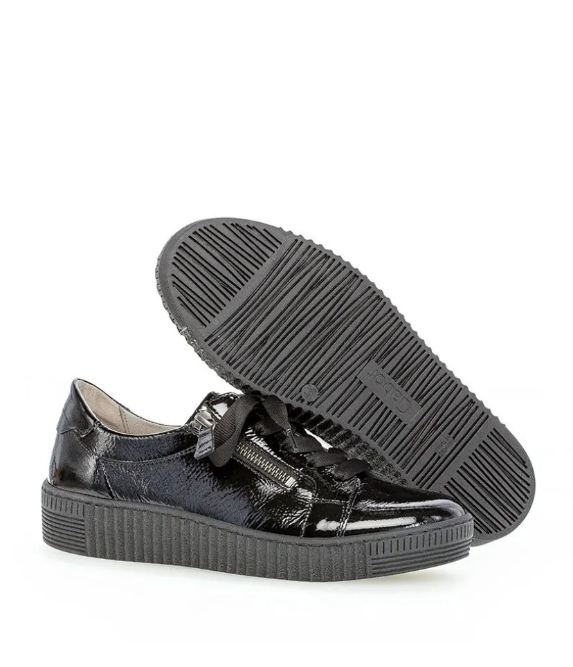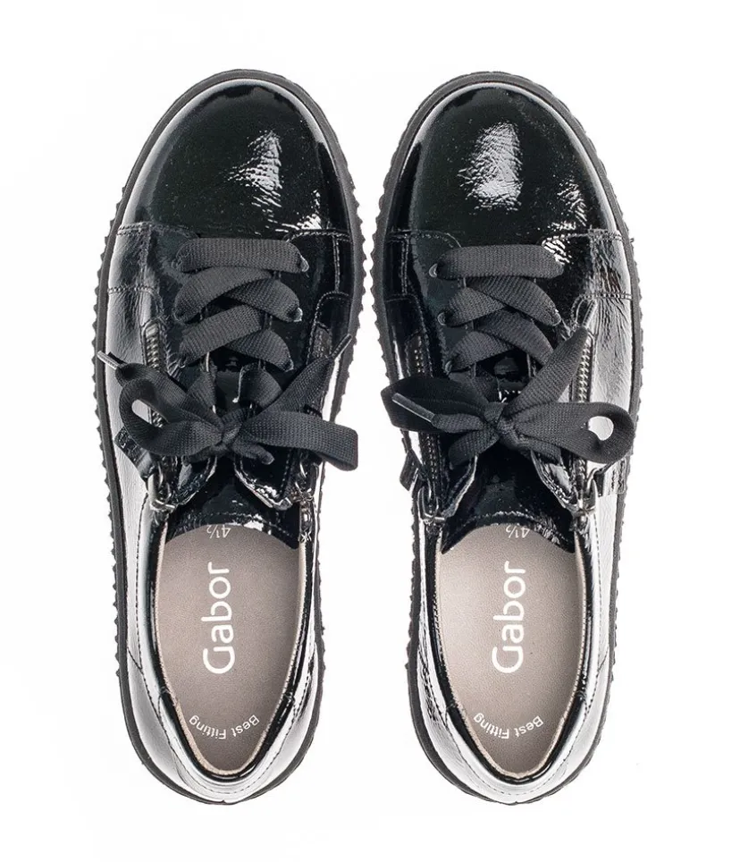 A great easy to wear trainer from Gabor featuring a patent leather upper which is super soft and will gently stretch to give you a unique and comfortable fit. The lace up front offers a secure fastening whilst the functional double side zips allows easy on and off. Soft lining and padded insole ensure incredible comfort during wear, and they also feature Gabor’s best comfort technologies which makes them so popular. The grooved sole unit is lightweight and flexible and will bring comfort with every step.