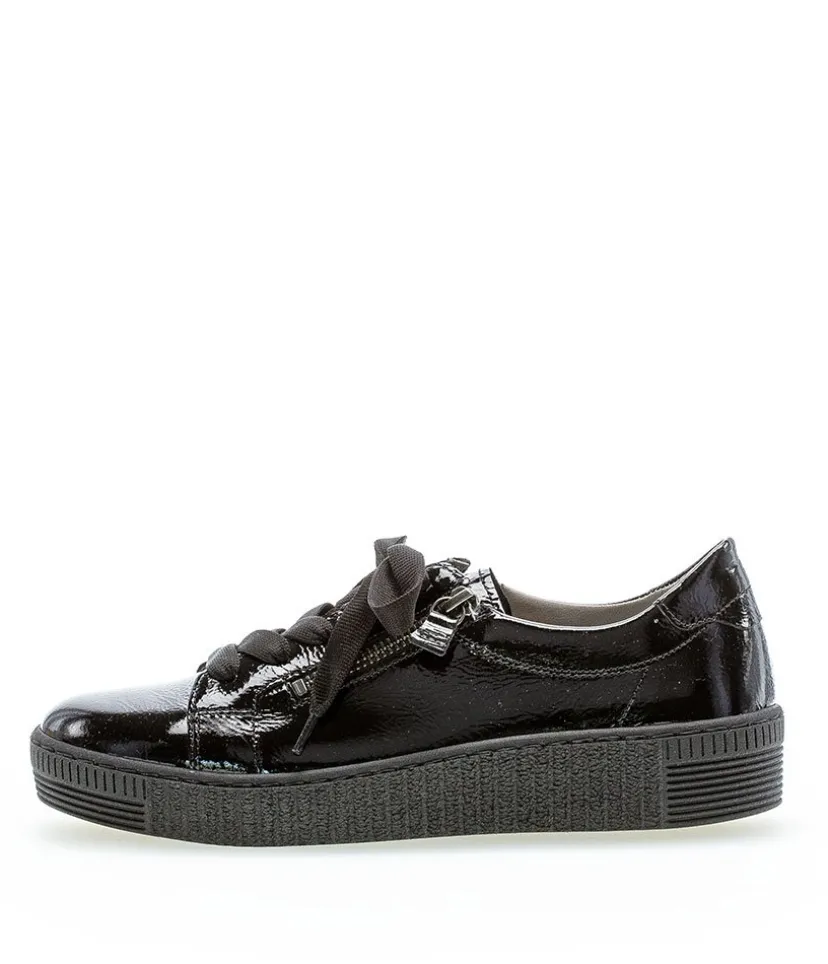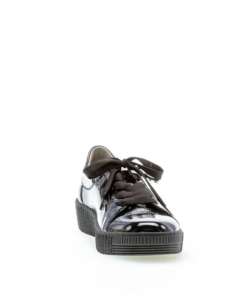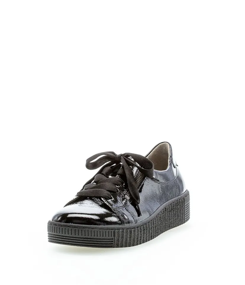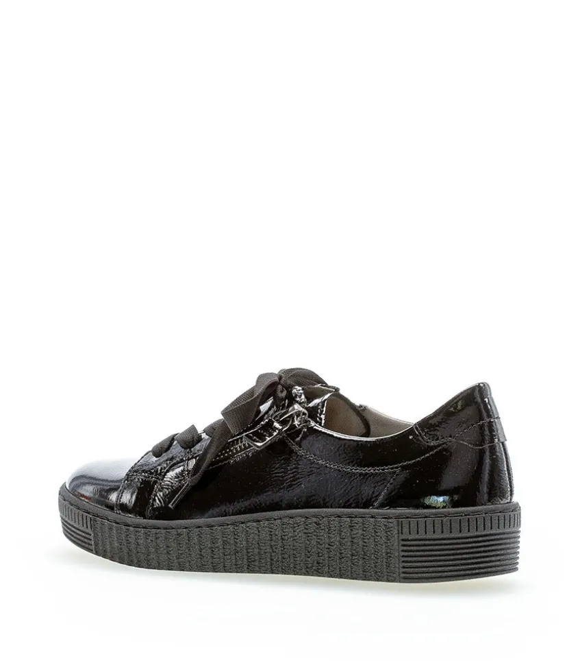 A great easy to wear trainer from Gabor featuring a patent leather upper which is super soft and will gently stretch to give you a unique and comfortable fit. The lace up front offers a secure fastening whilst the functional double side zips allows easy on and off. Soft lining and padded insole ensure incredible comfort during wear, and they also feature Gabor’s best comfort technologies which makes them so popular. The grooved sole unit is lightweight and flexible and will bring comfort with every step.