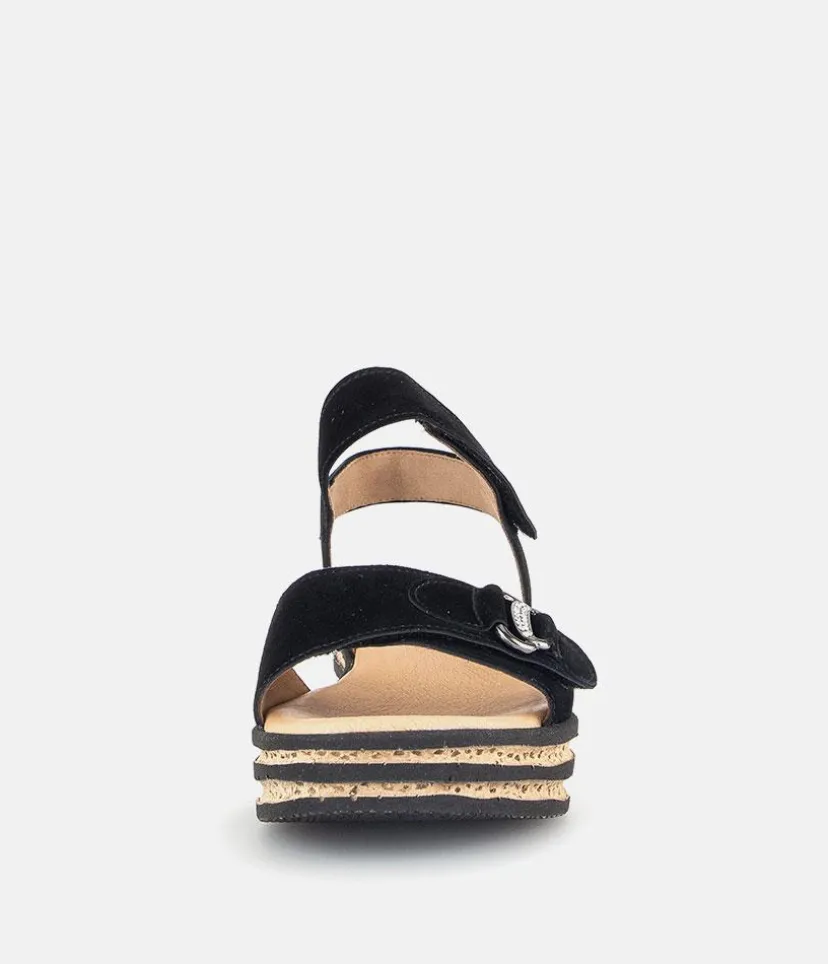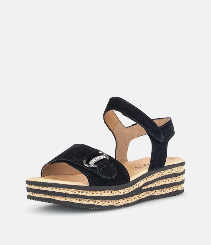 This Sandal from Gabor is a Beautiful Combination of style and comfort that can be worn for a wide variety of occasions. These comfortable wedge sandals have a patterned wedge sole, a velcro strap for easy on and off and a 6.5 cm wedge heel.