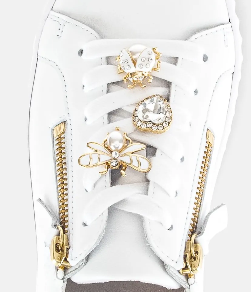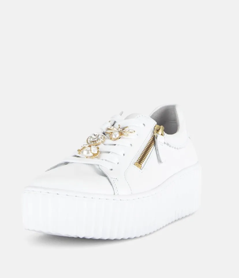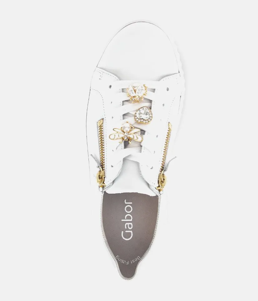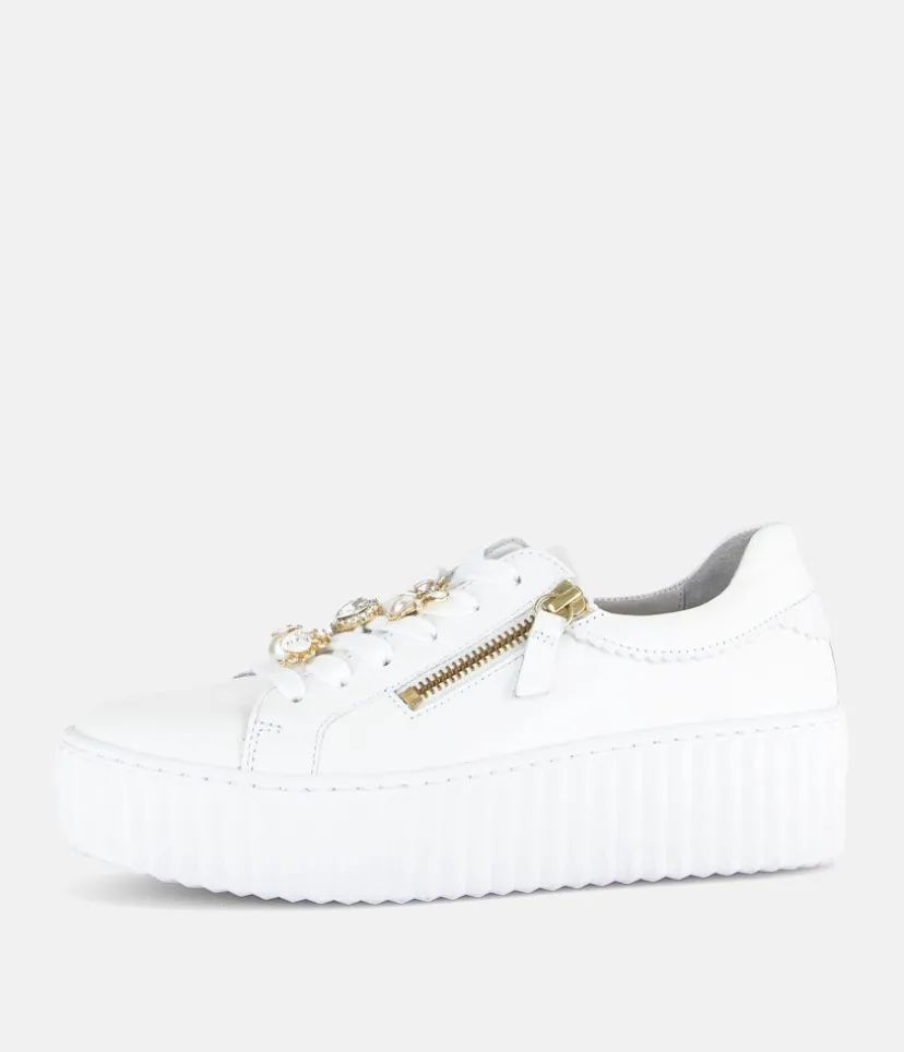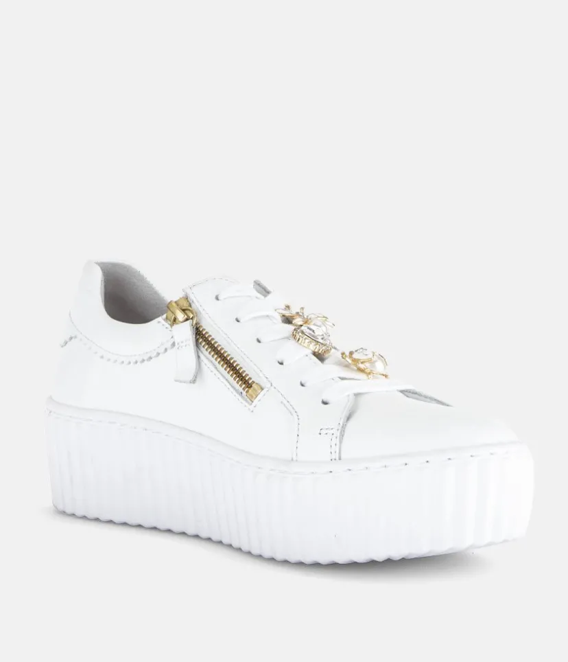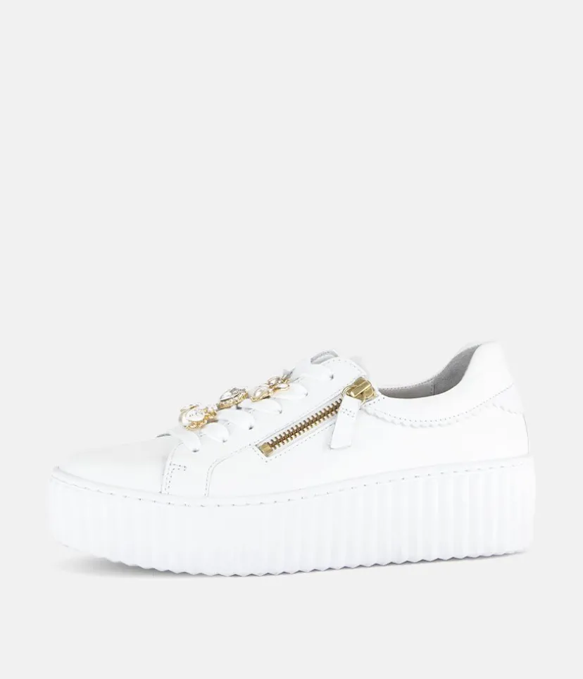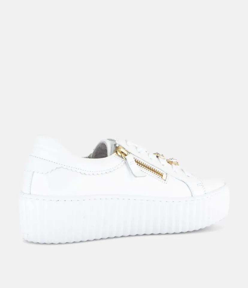 A Stylish white leather sneaker from Gabor with a platform sole featuring stylised grooving for a textured finish. Featuring double gold zips and fabulous gold embellishments; this is a fantastic fashionable style to have in your wardrobe that can be worn with a wide variety of looks and outfits. This sneaker is designed for all-day comfort with a soft leather and textile lining and a cushioned leather insole.