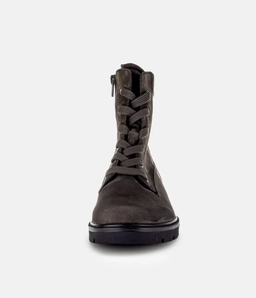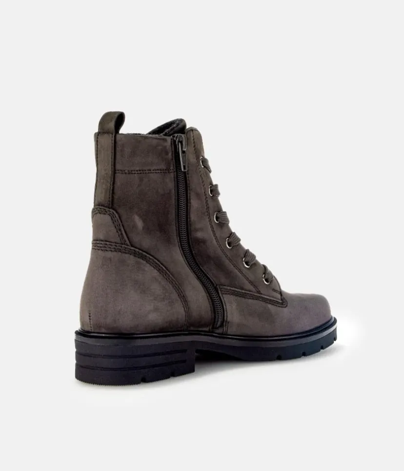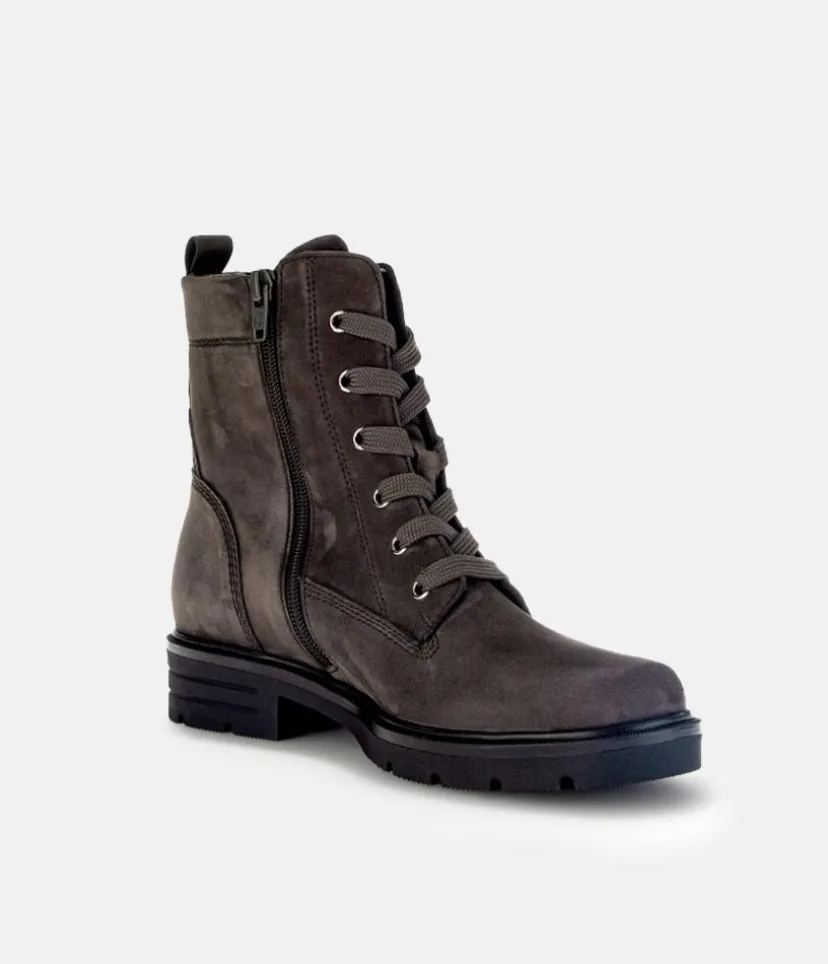 These Gabor Lace Up Ankle Boots are a fashionable style, yet practical for everyday wear. A soft pepper grey leather upper sits on a chunky trendy black sole. The side zip and laces makes this style easy to put on and take off while also allowing for an adjustabe fit. Gabor’s Best Fitting technology feature a broadened insole and widened tread area, delivering an increased step surface for the ball area of the foot.