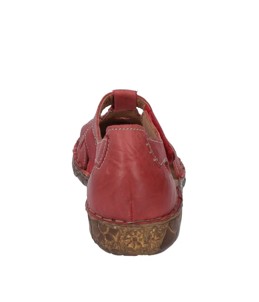 A Stylish Red leather lightweight closed toe sandal with cross strap design. Crafted from soft leathers with a cushioned leather lining, sitting atop a flexible and durable sole. Round toe sandal with an adjustable strap and hand stitched finish.
