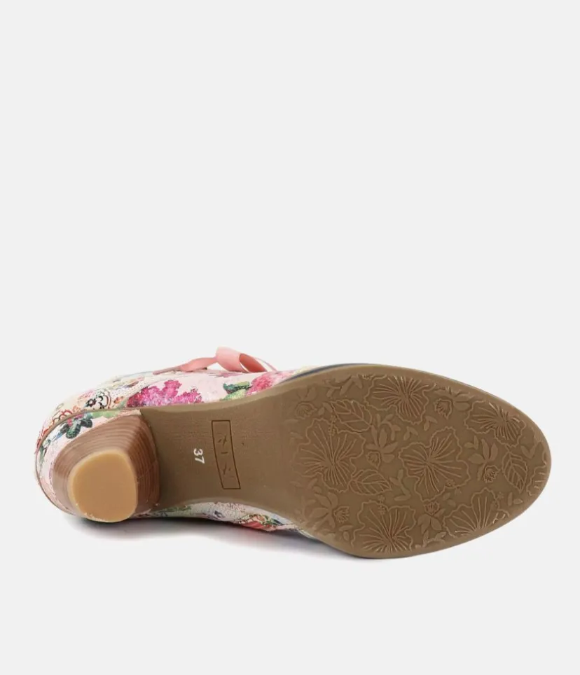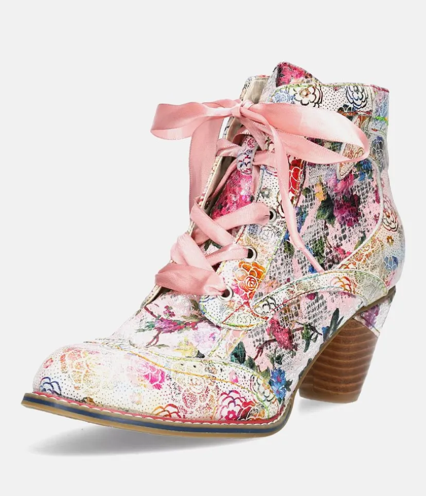 This is a Beautiful Ankle boot from Laura Vita in a Pretty pink floral pattern and pink silk laces which finish them to perfection. A striking yet versatile addition to your wardrobe this season. Featuring a sturdy block heel and a side zip for easy on and off.