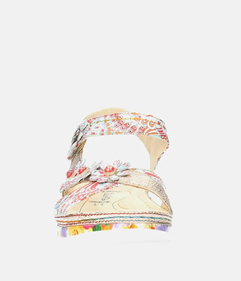 This Beautiful sandal stands out with it’s pretty colourful upper and cut out flowers detailing. The contoured wedge sole ensures a very comfortable fit. Add this style to your wardrobe this season to add a splash of colour to your outfits.