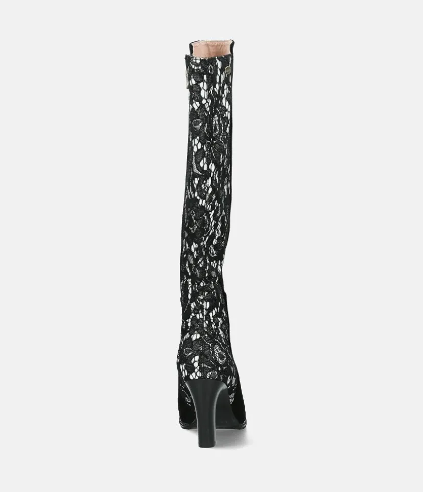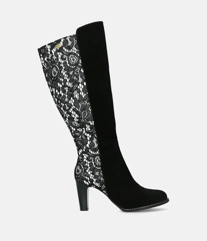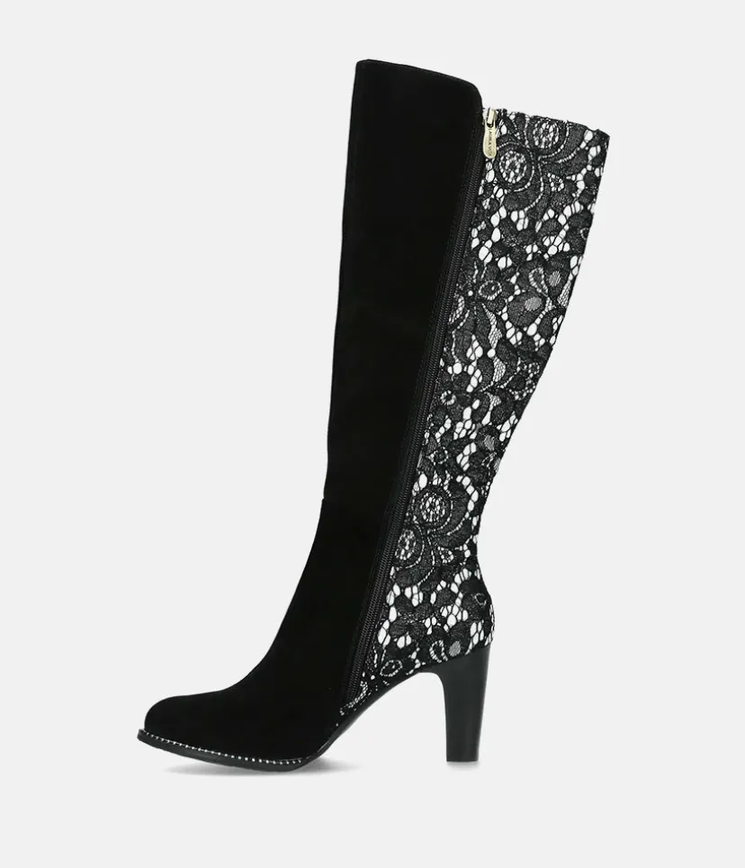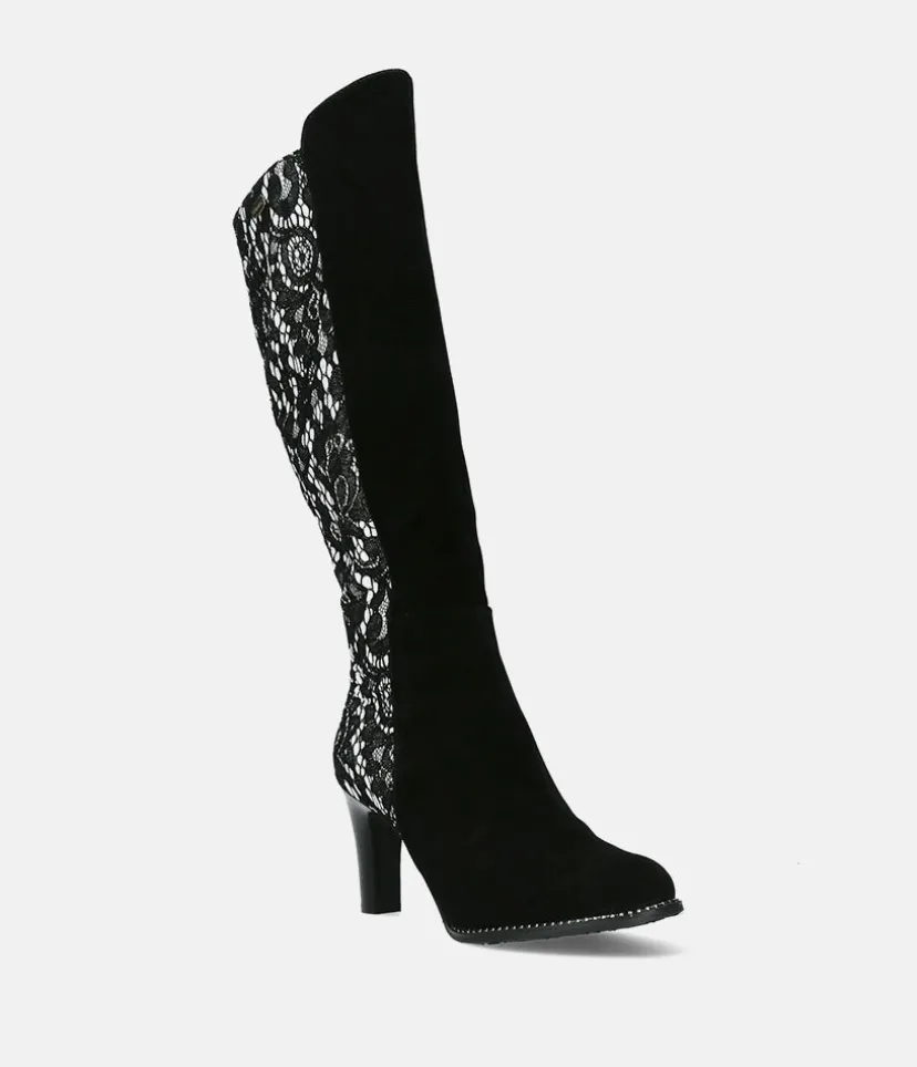 This is a Stylish long boot from Laura Vita in Black with a combination of lace and suede on the upper. Add some luxury to your wardrobe with these long boots; an ideal option for any special occasion.