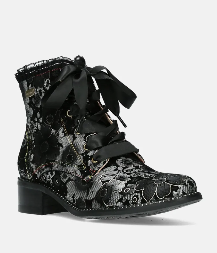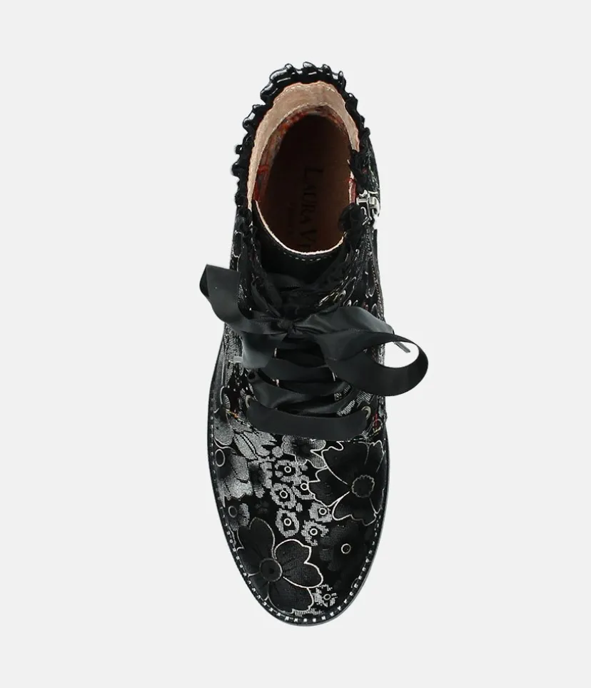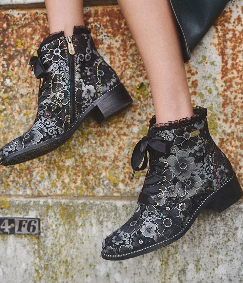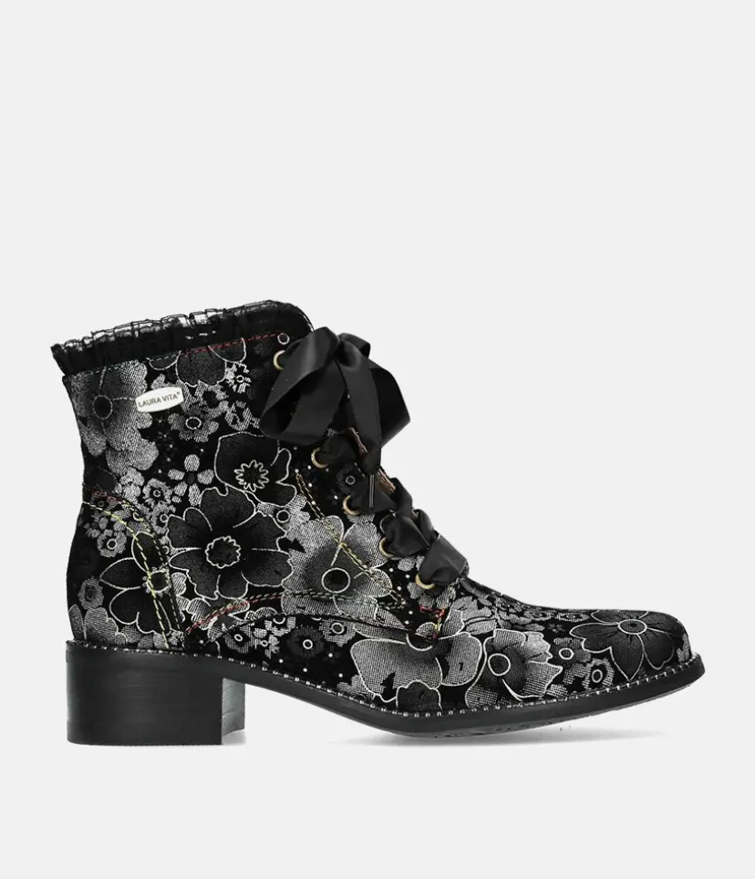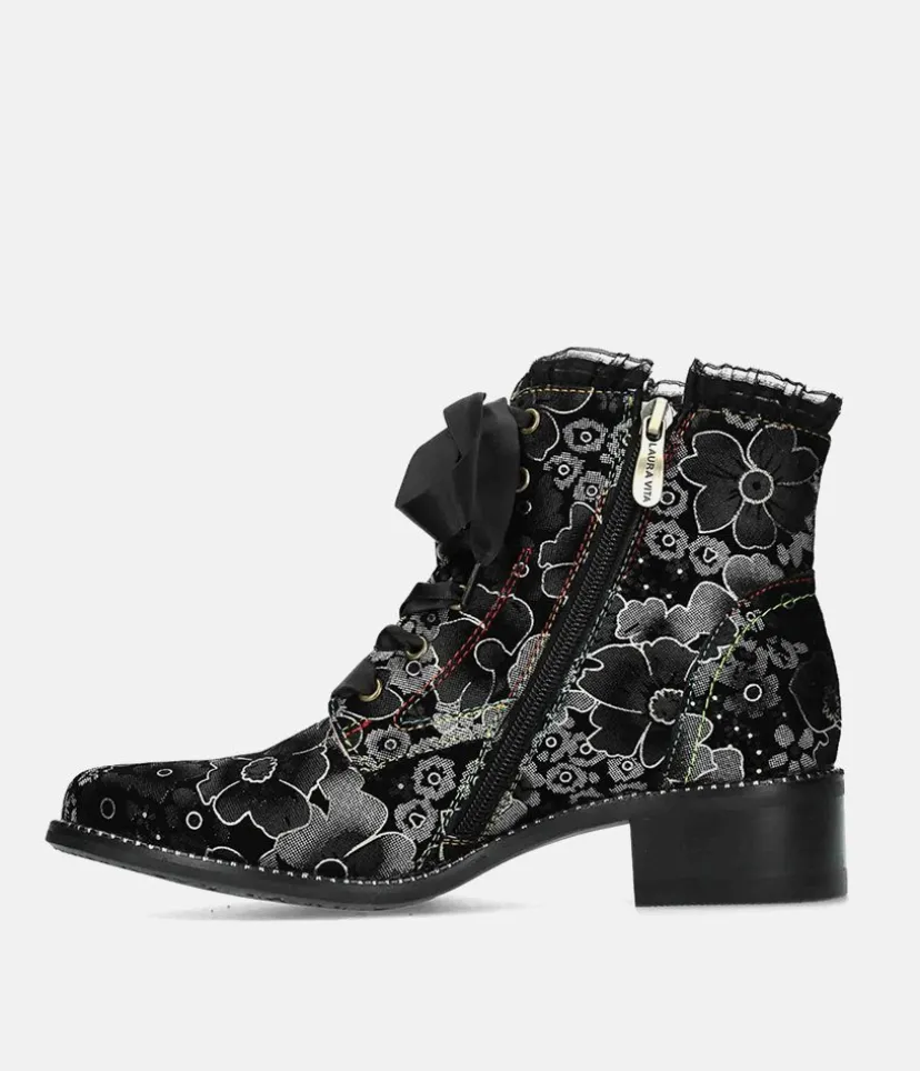This is a Beautiful Ankle boot from Laura Vita in Black with a pretty floral pattern. Featuring a sturdy low block heel, side zip for easy on and off and laces to ensure a secure fit.