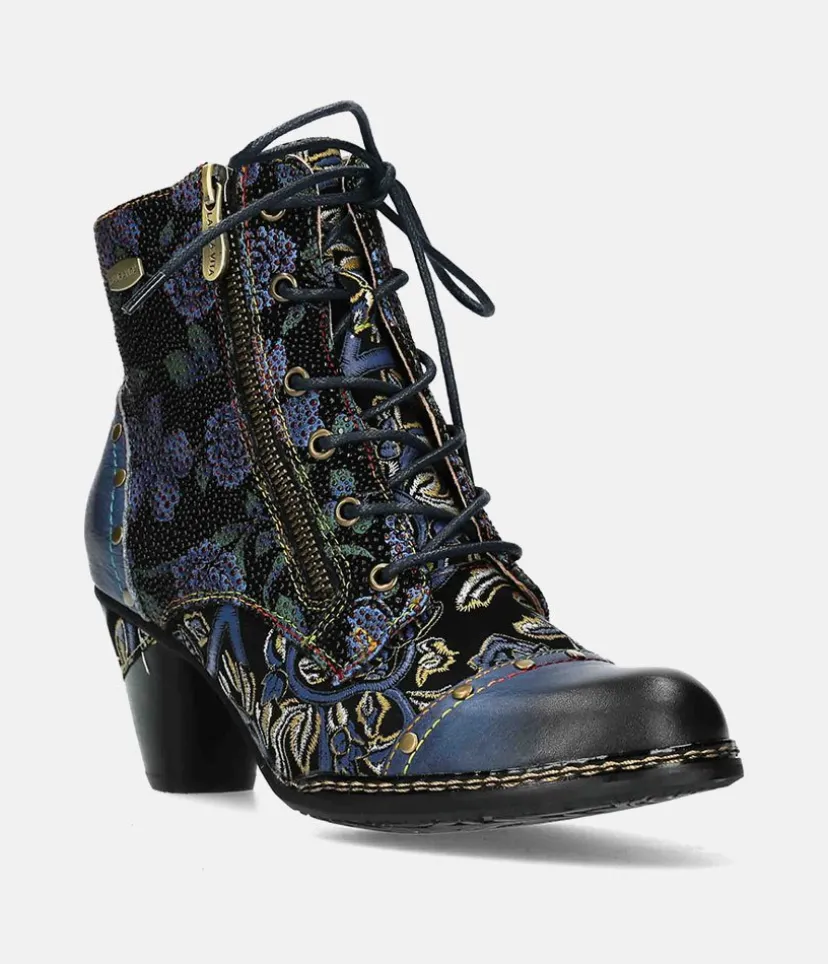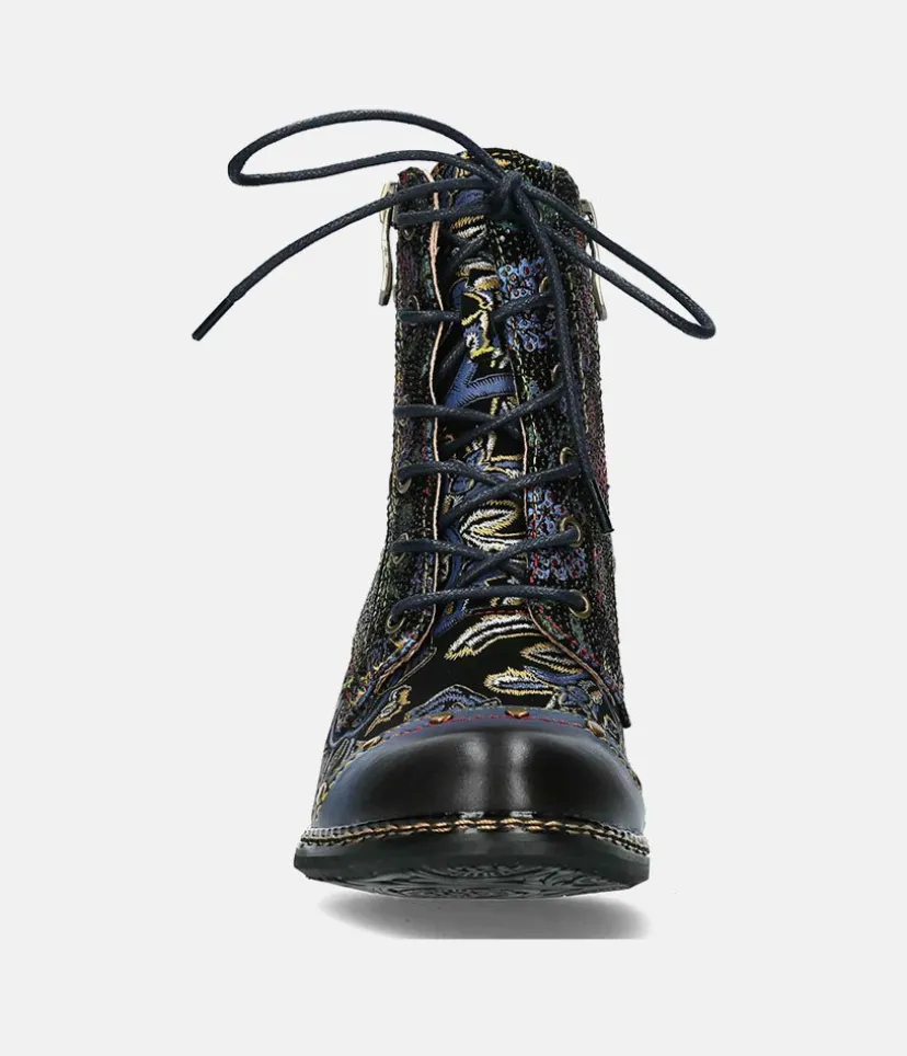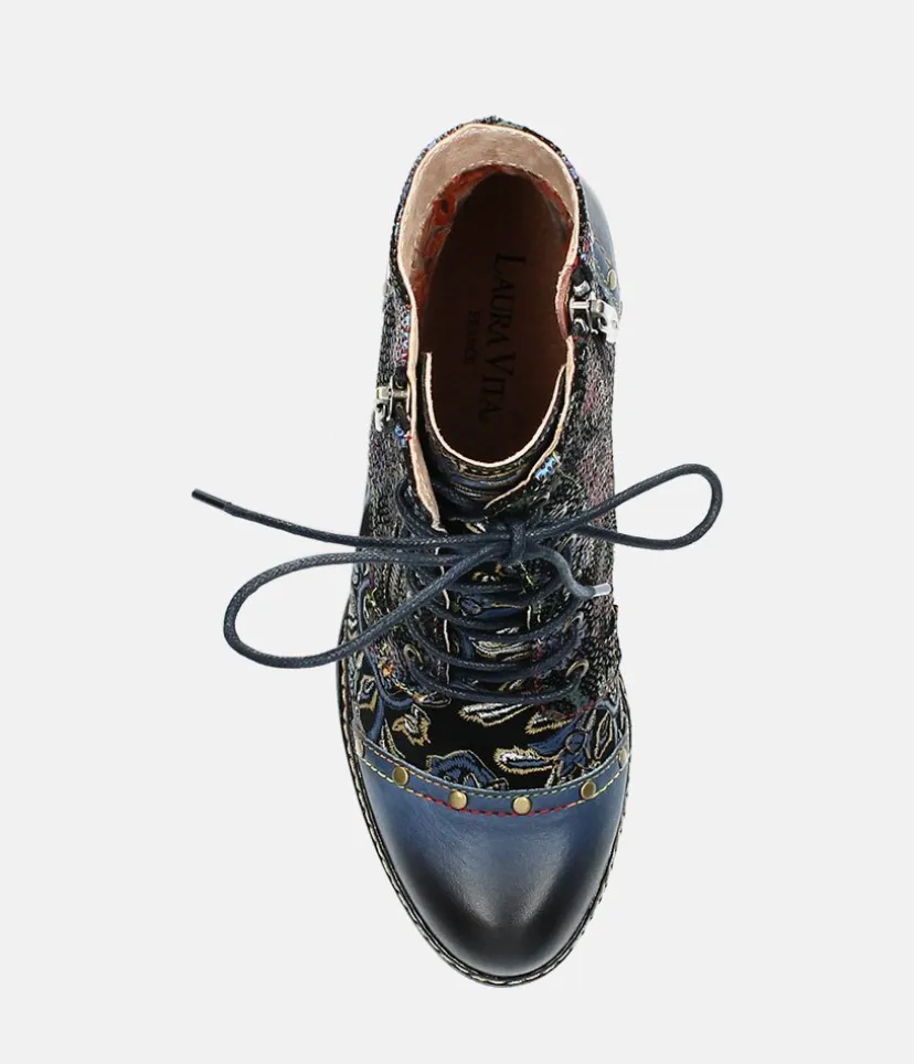 This is a Beautiful Ankle boot from Laura Vita featuring a lovely floral pattern. These ankle boots and will add sophisticated style to your autumn outfits. A sturdy cone block heel, side zip for easy on and off and and laces ensure a secure fit.