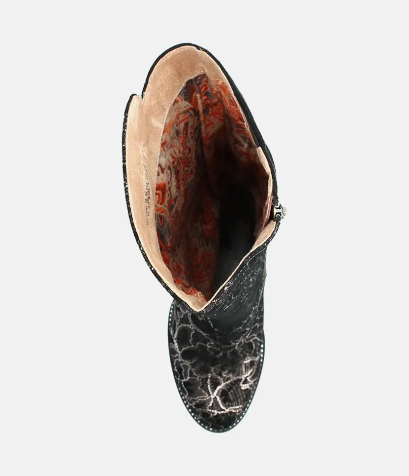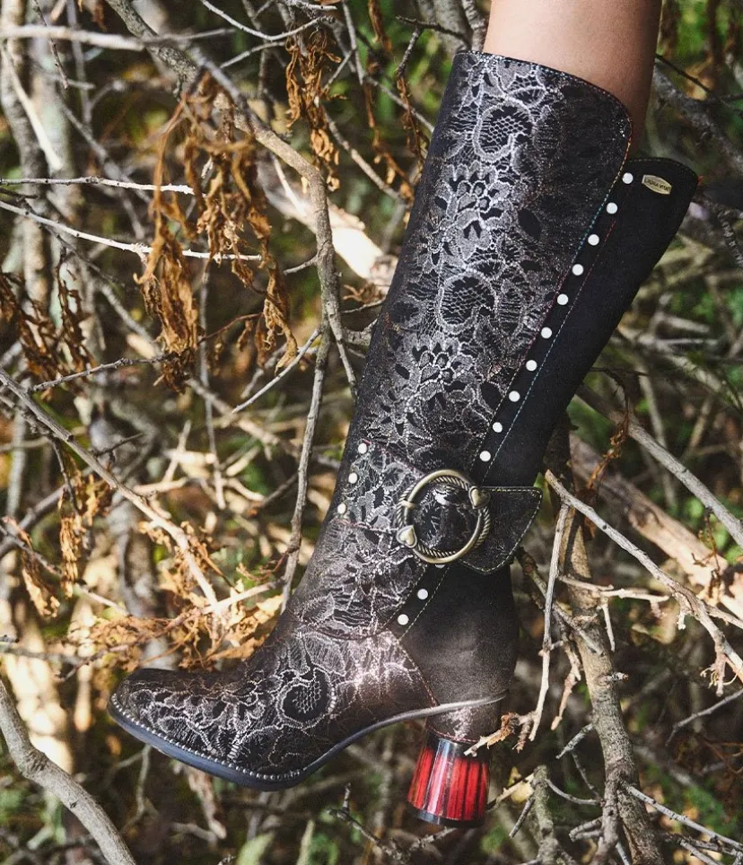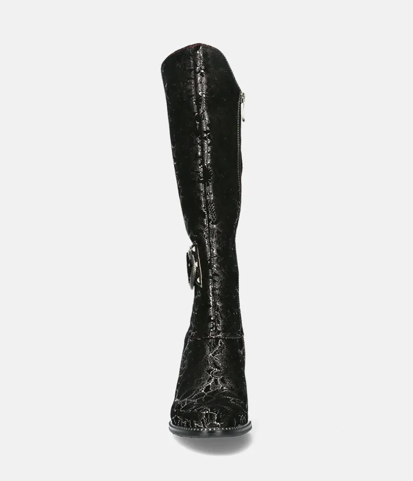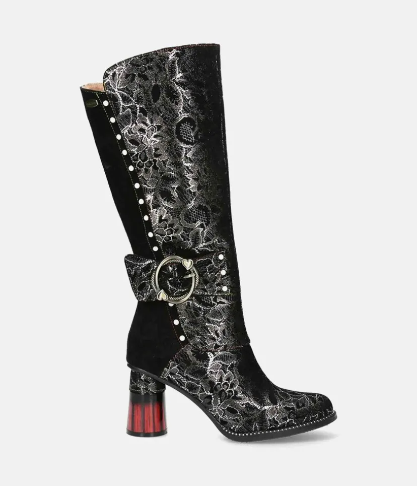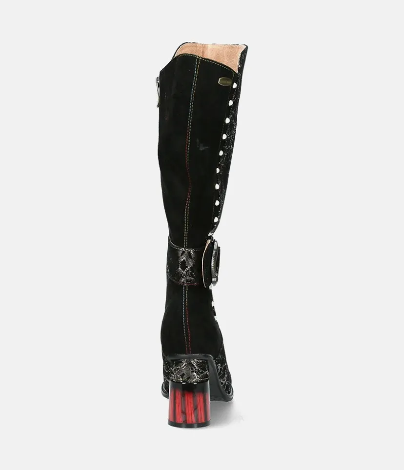 This is a fantastic long boot from Laura Vita in Black with a lovely pattern on the upper and contrasting black suede. These boots feature a fabulous round block heel, buckle detail with hearts and studding to give them that Wow factor! Featuring a side zip for easy on and off and laces to ensure a secure fit. If you’re looking for some drama in your life then these boots are for you!