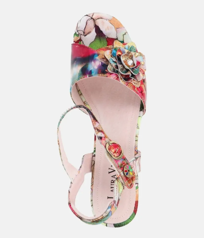This is a Fantastic lookign sandal from Laura Vita with its fabulous block heel and burst of colour on the upper. A perfect style to wow for any special occasions.