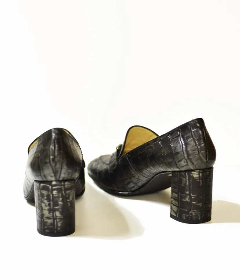 Elevate your smart-casual ensembles with these loafers. We’ve taken the classic loafer silhouette and added a flared block heel, creating a sturdy base that won’t let you down. These Grey/Black loafers feature a gorgeous Croc finish with padded insole and leather lining. Team with culottes and a blouse to show off this gorgeous shoe.