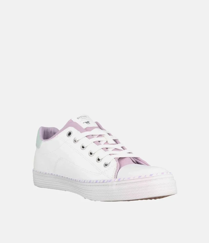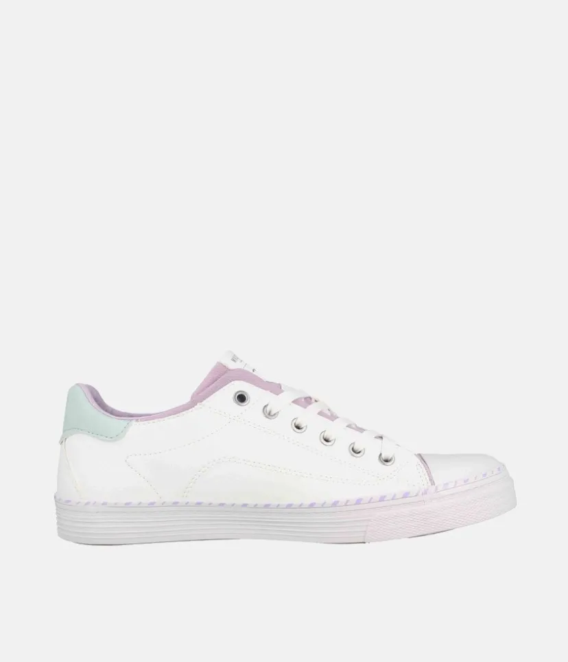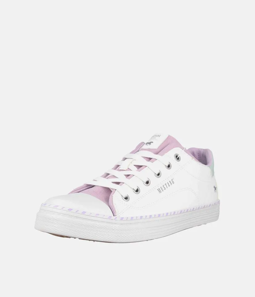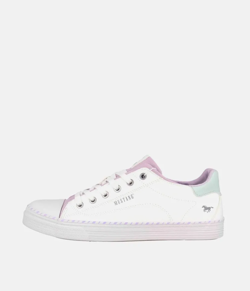 This is a Super cute lace up casual trainer from Mustang with a blue tongue and pink trim, perfect for a wearing with Jeans or a casual outfit.