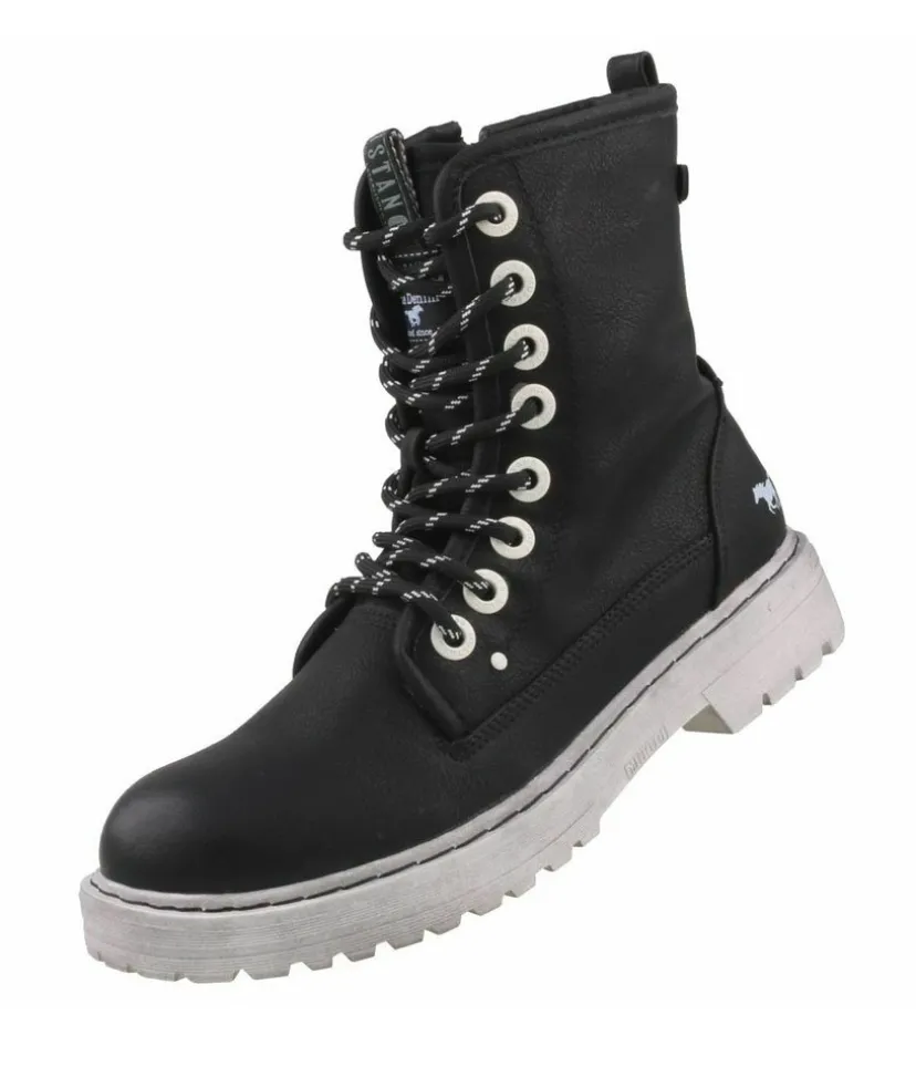 A Trendy lace-up boot from Mustang with contrasting sole. Featuring two tone lacing for a variable fit and a side zip for easy on and off. Profiled outsole and soft textile inner lining for a comfortable fit.