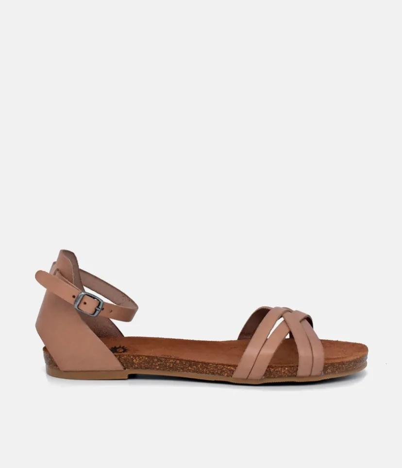 A Simple classic sandal from Cosmos Comfort by Mustang. A leather open-toe sandal with cross over straps on the upper and ankle strap fastening.The leather covered footbed supports the natural movement of the foot and improves posture . The soft sole cushions impact and relieves spine and joints.