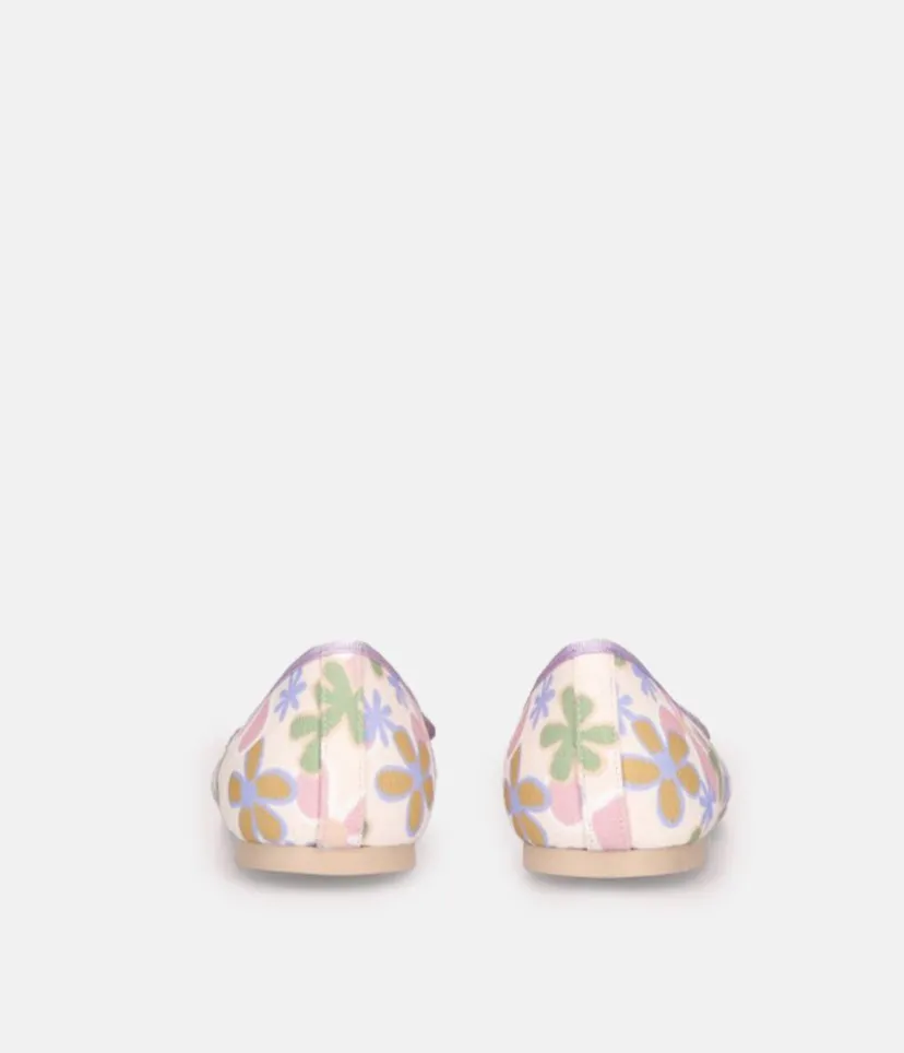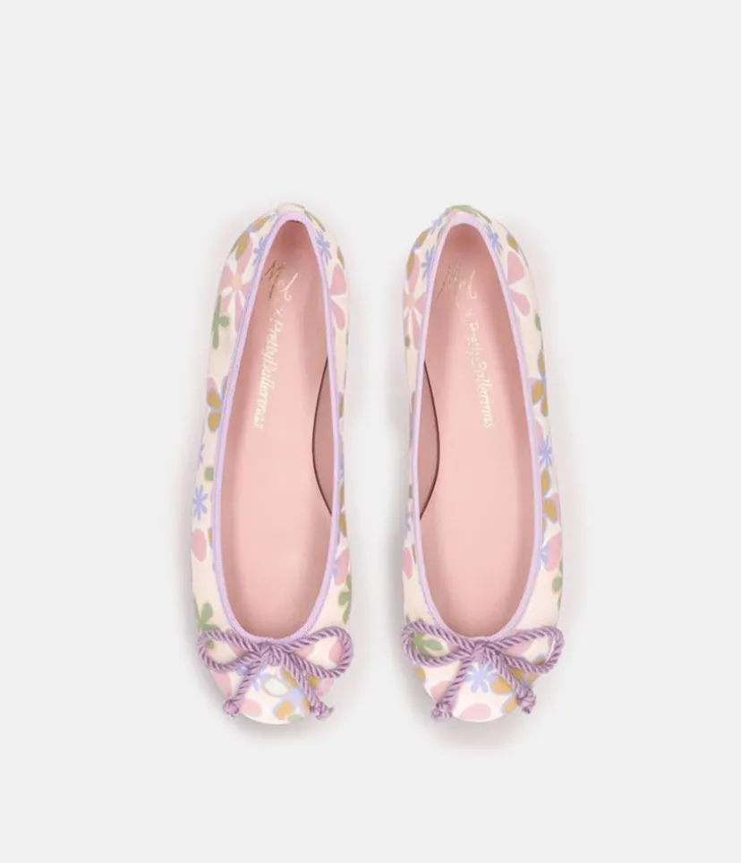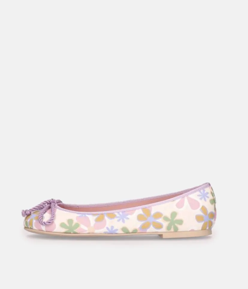 A Classic Pretty Ballerina style in a Floral print and finished to perfection with a delicate lavender rope-bow and trim detail. A flexible undersole and cushioned insole making them super comfy to wear too.