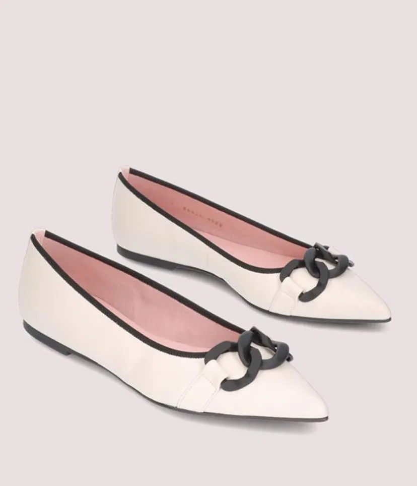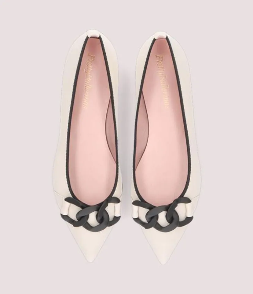 This Sophisticated Ballerina with a pointed toe comes in a soft ivory leather featuring a black chain embellishment on the vamp, with a flexible undersole and cushioned insole making them super comfortable to wear.