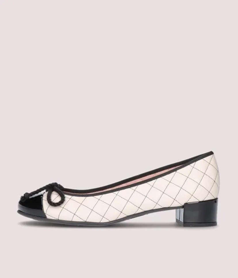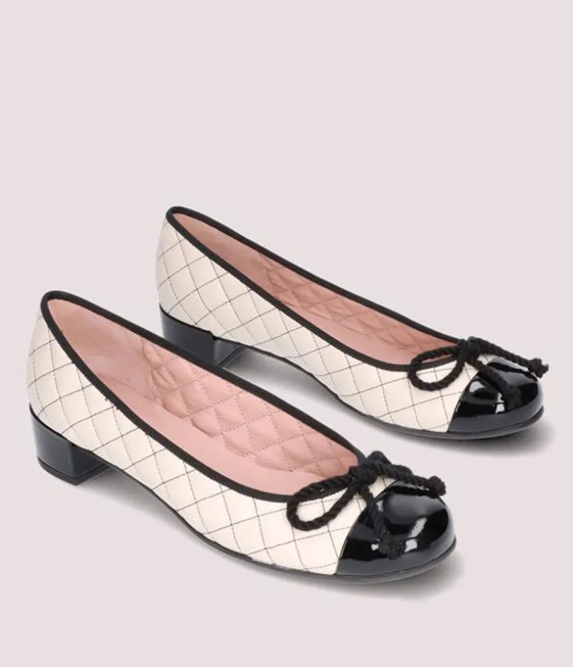 These Low Cut leather Ballerinas in Beige Quilted leather are so stylish, with a flexible undersole and cushioned insole making them super comfortable to wear. This style features a contrasting black patent toe cap, Black Heel and a delicate Black rope-bow.