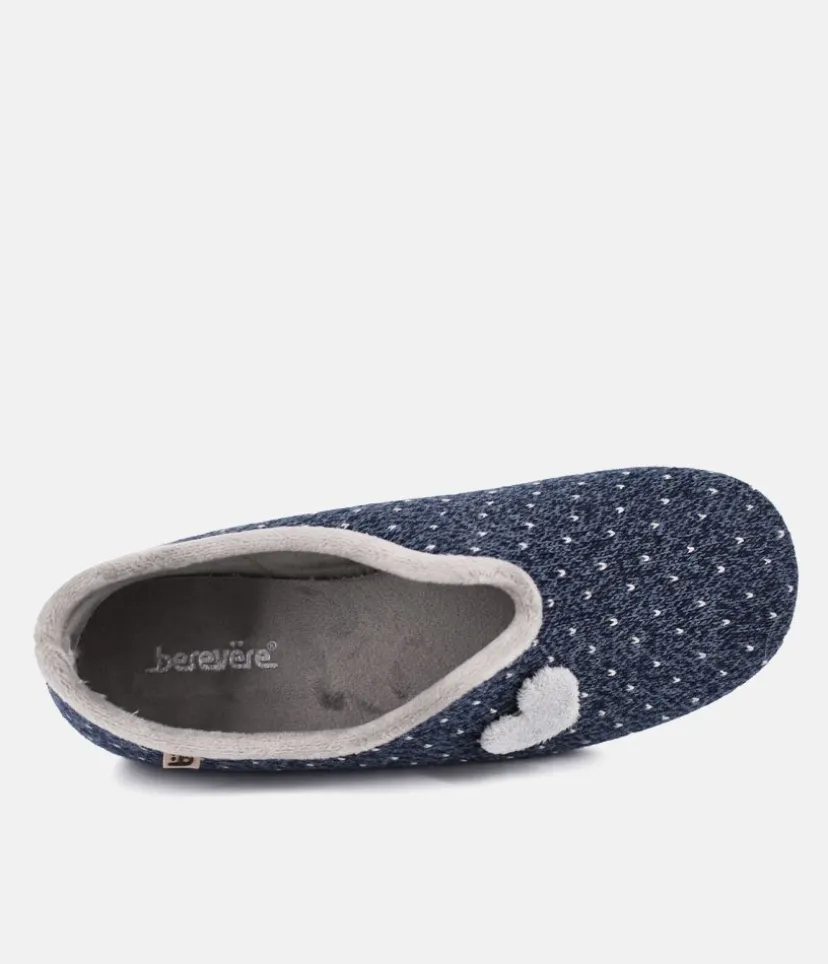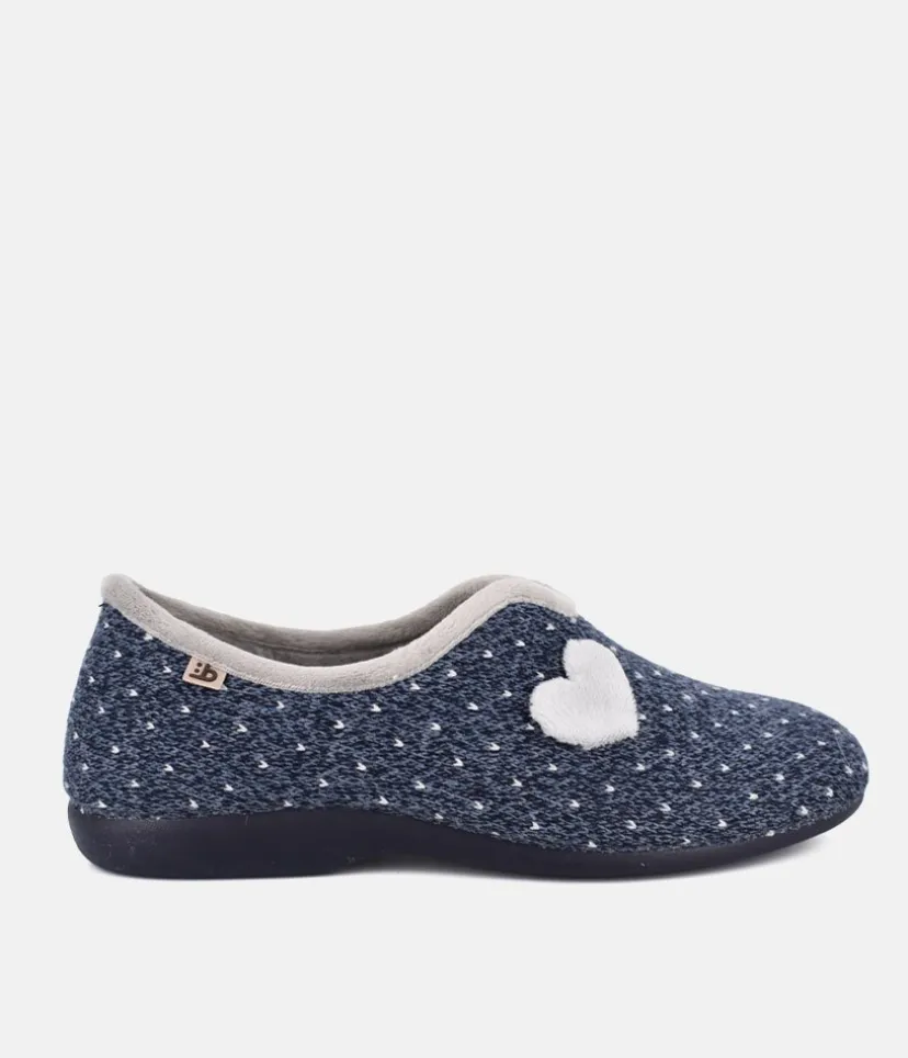 These pretty slippers are made of super soft and warm textile material that will provide you with the greatest comfort in your moments of relaxation at home. Navy blue with grey polka dot and decorative heart shape. Made in Spain with ultralight sole and cushioned removeable insole.