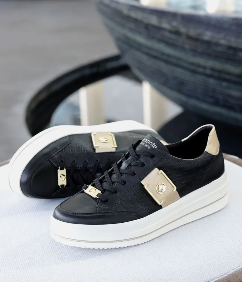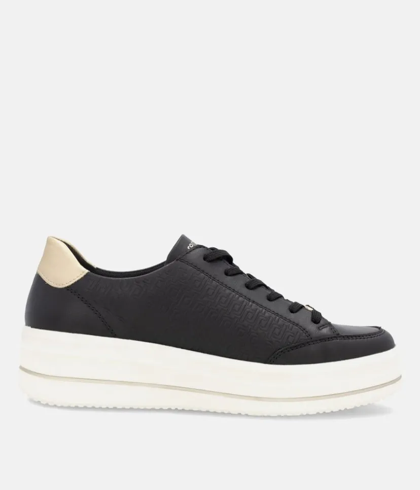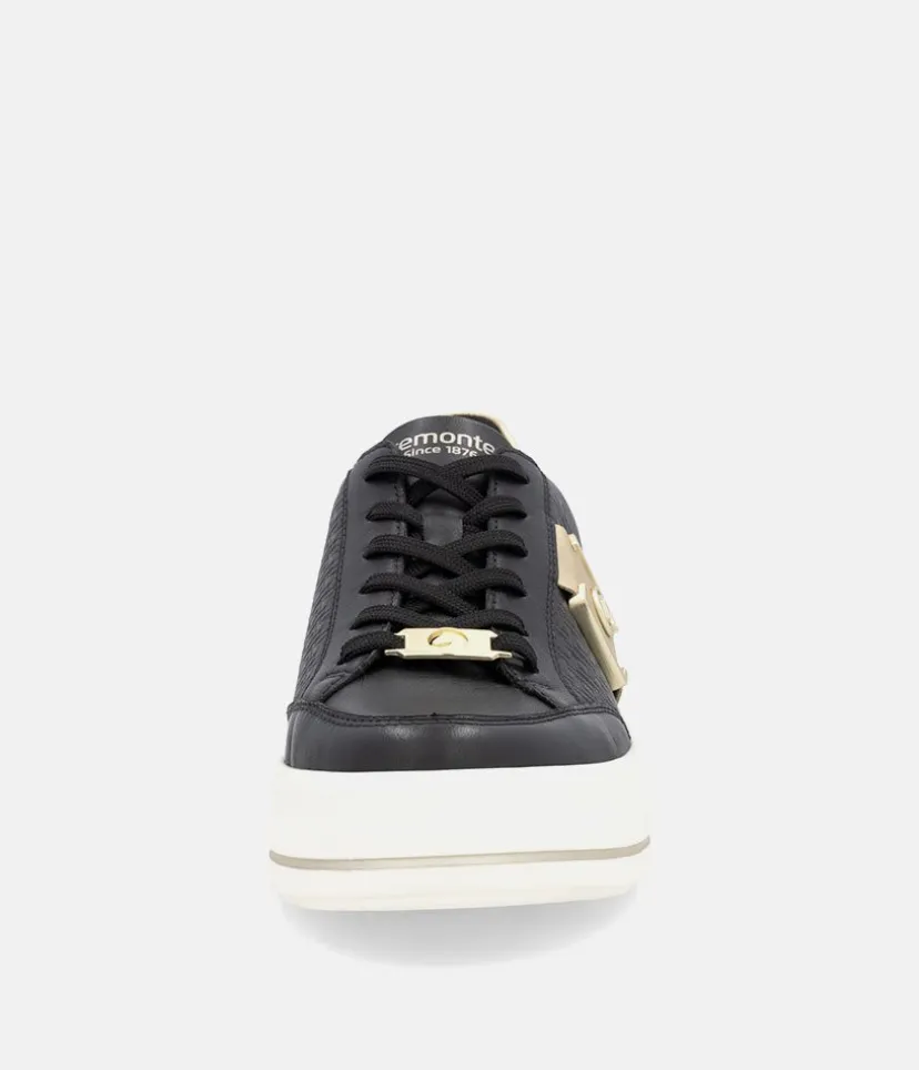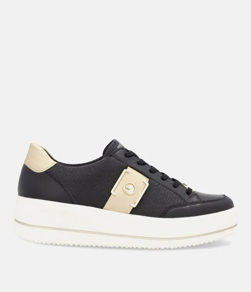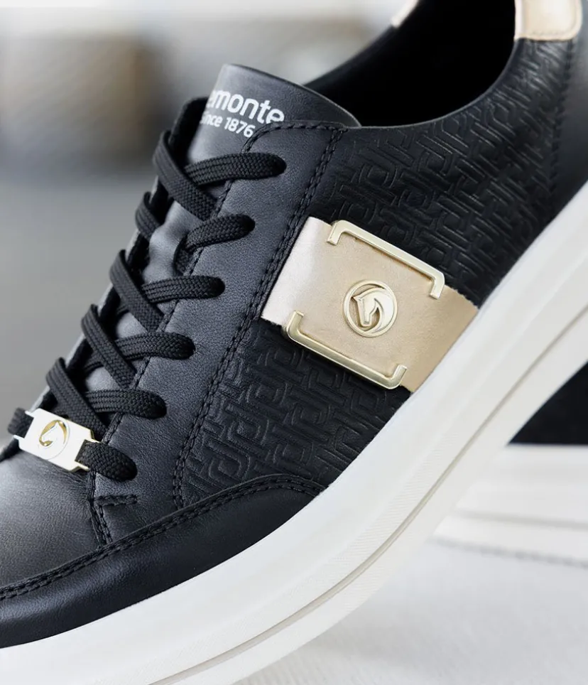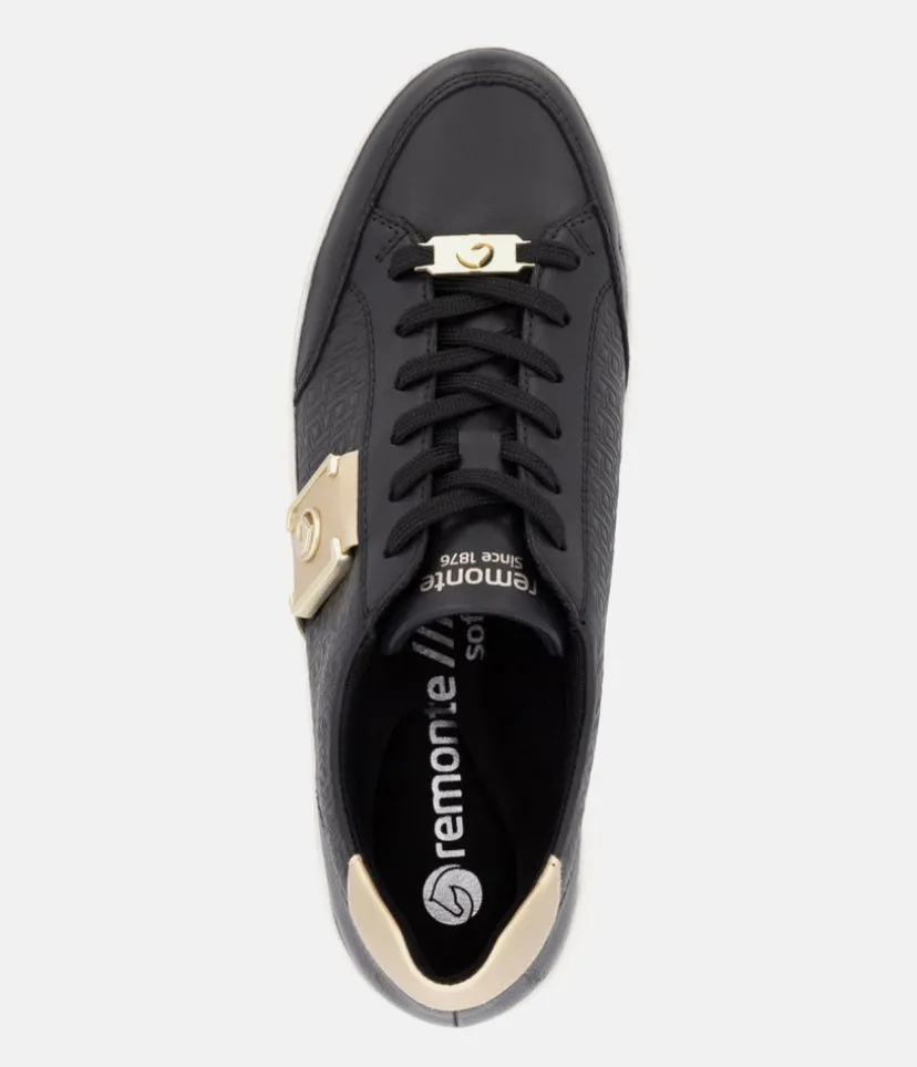 Elevate your style with these Remonte Black & Gold Trainers; made of durable leather and synthetic materials for durability and longevity. The cushioned and removable soft insole provides optimal comfort and moulds to the contours of your foot. The laces allow for an adjustable fit and this lightweight and stylish sneaker goes effortlessly with jeans and trousers for a versatile and fashionable look.