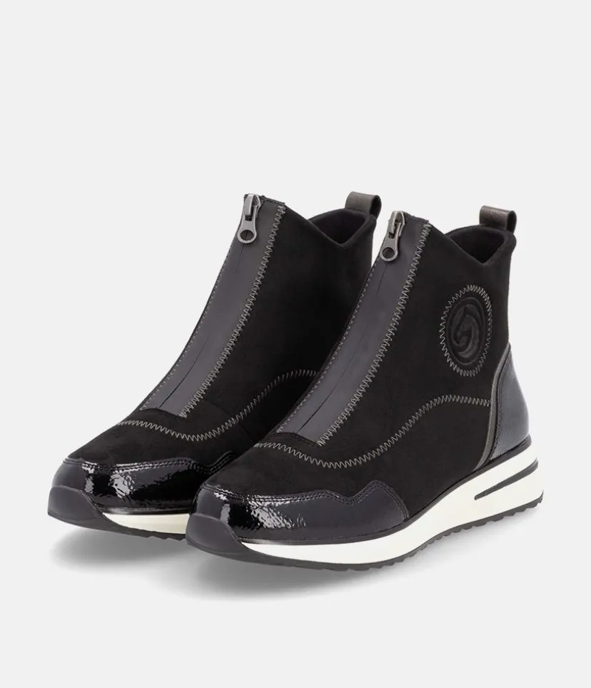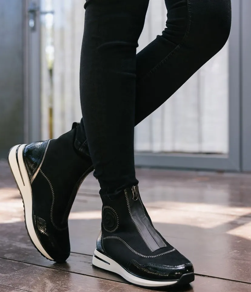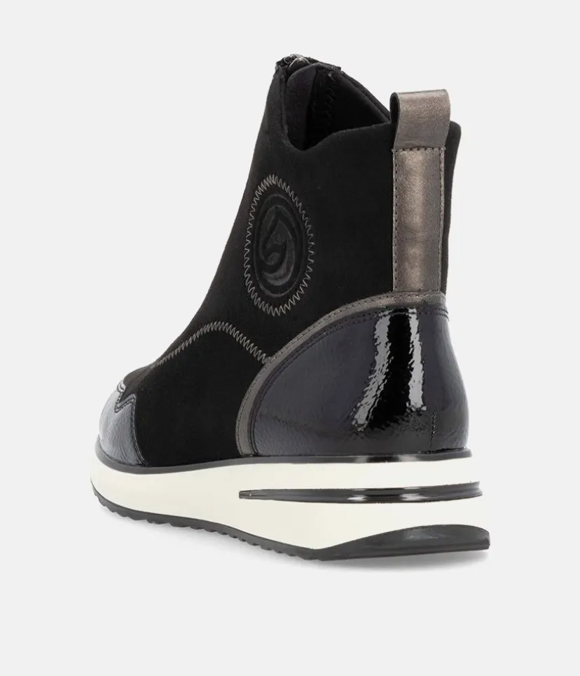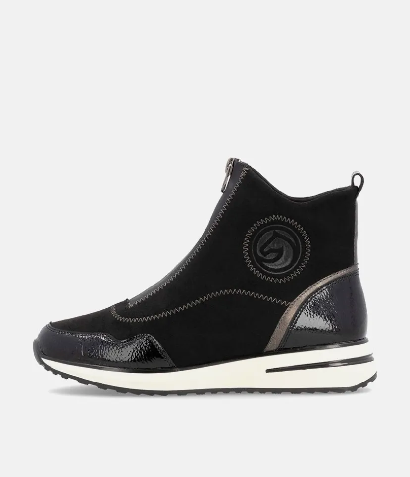 A Super comfortable and stylish ankle boot trainer from Remonte. Featuring a combination upper in a mix of black patent, and suedette and is fastened by a zip down the middle. Finished with a wedge heel for added height without losing on comfort. These boots are decorated with decorative zig-zag stitching for a fashionable touch and the Remonte Lite ‘n Soft technology offers an ultra-soft sole and a removable, cushioned insole for a comfortable fit.