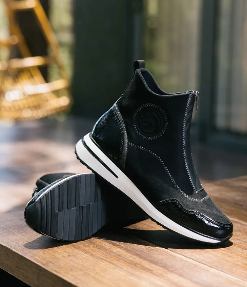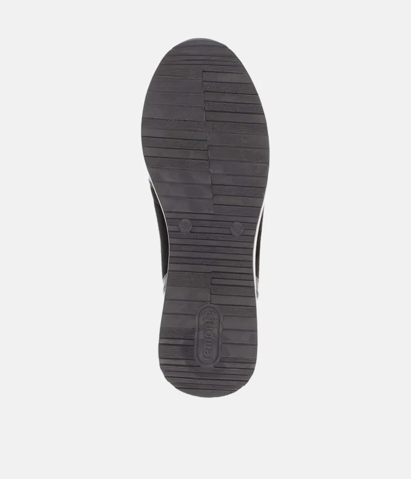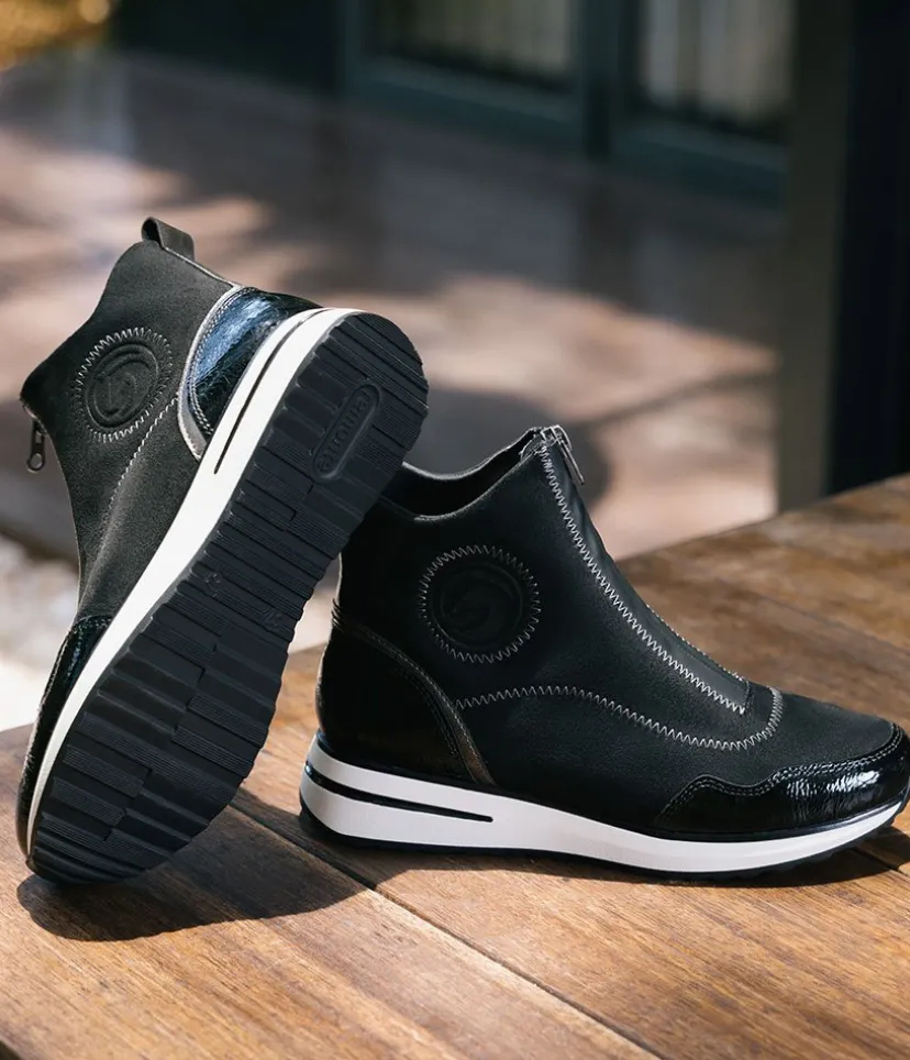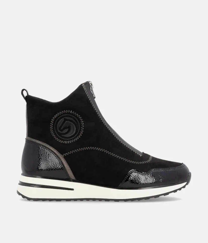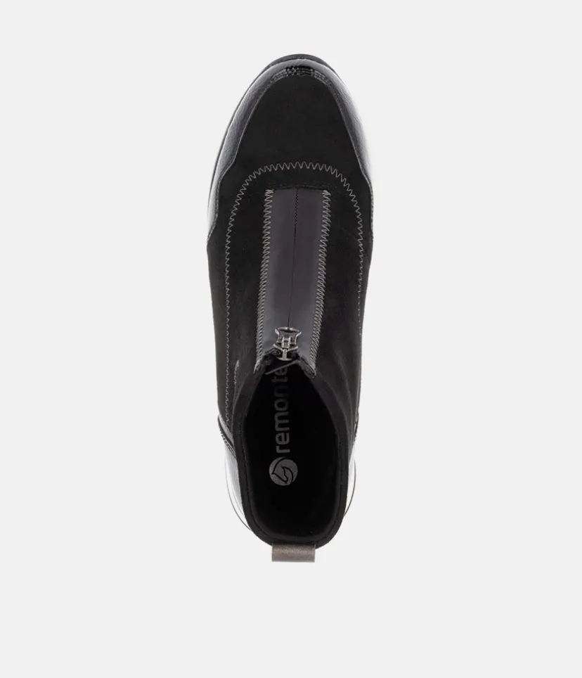 A Super comfortable and stylish ankle boot trainer from Remonte. Featuring a combination upper in a mix of black patent, and suedette and is fastened by a zip down the middle. Finished with a wedge heel for added height without losing on comfort. These boots are decorated with decorative zig-zag stitching for a fashionable touch and the Remonte Lite ‘n Soft technology offers an ultra-soft sole and a removable, cushioned insole for a comfortable fit.