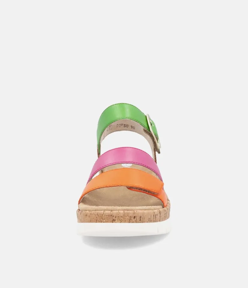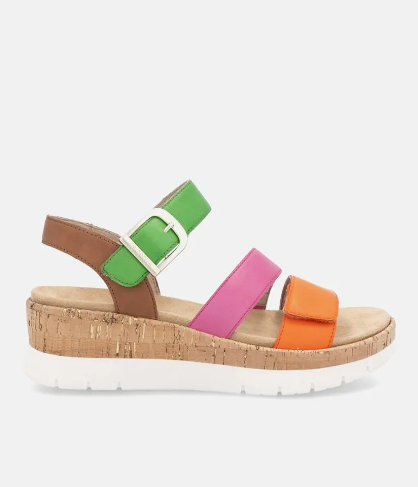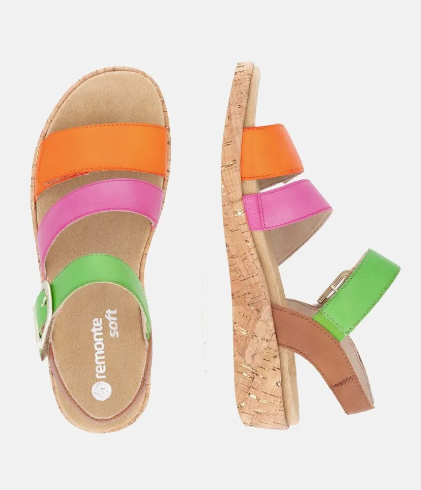 This is a Colourful new style from Remonte featuring a Strappy upper with a contrasting outsole. They are not just stylish, but practical for everyday use. Ideal to pack for a vacation to pair with just about any outfit from shorts to long dresses and Jeans.